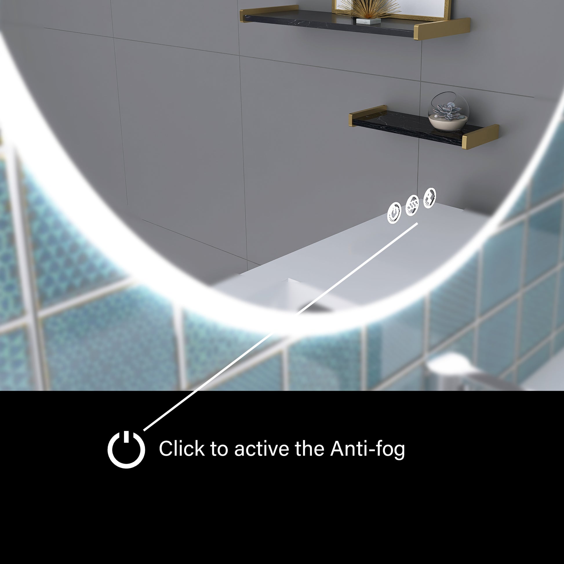 - [Three-Touch Sensor] Easy to use using the three-touch sensor with a clear logo. [3-Color Temperatures and Dimmable] This bathroom mirror has three color temperatures that can be adjusted. Suitable for bathrooms, hotels, salons, and other places. You can also adjust the brightness of the light from light to dark according to your needs.