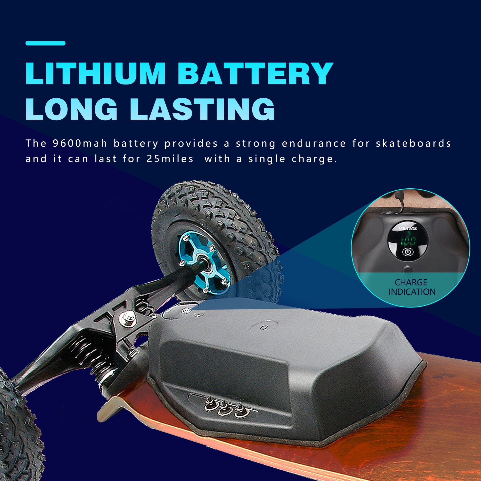 - ①Big Battery capacity :The 9600mah battery provides a strong endurance for skateboards and it can last for 25miles with a single charge.