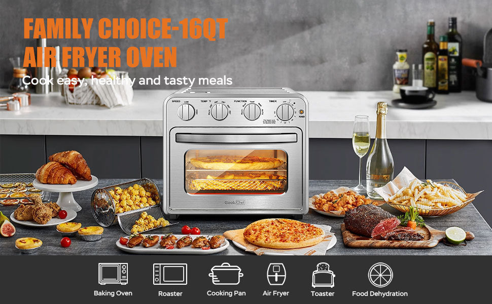 - New Space Saving Design: Compact design,but large capacity. 16 QT and 3 rack levels allow you to prepare family-size meal for up to 6 people at once.Compact design takes less room on the countertop and air fries up to 2.5 lb of food,toasts 4 slices of bread.