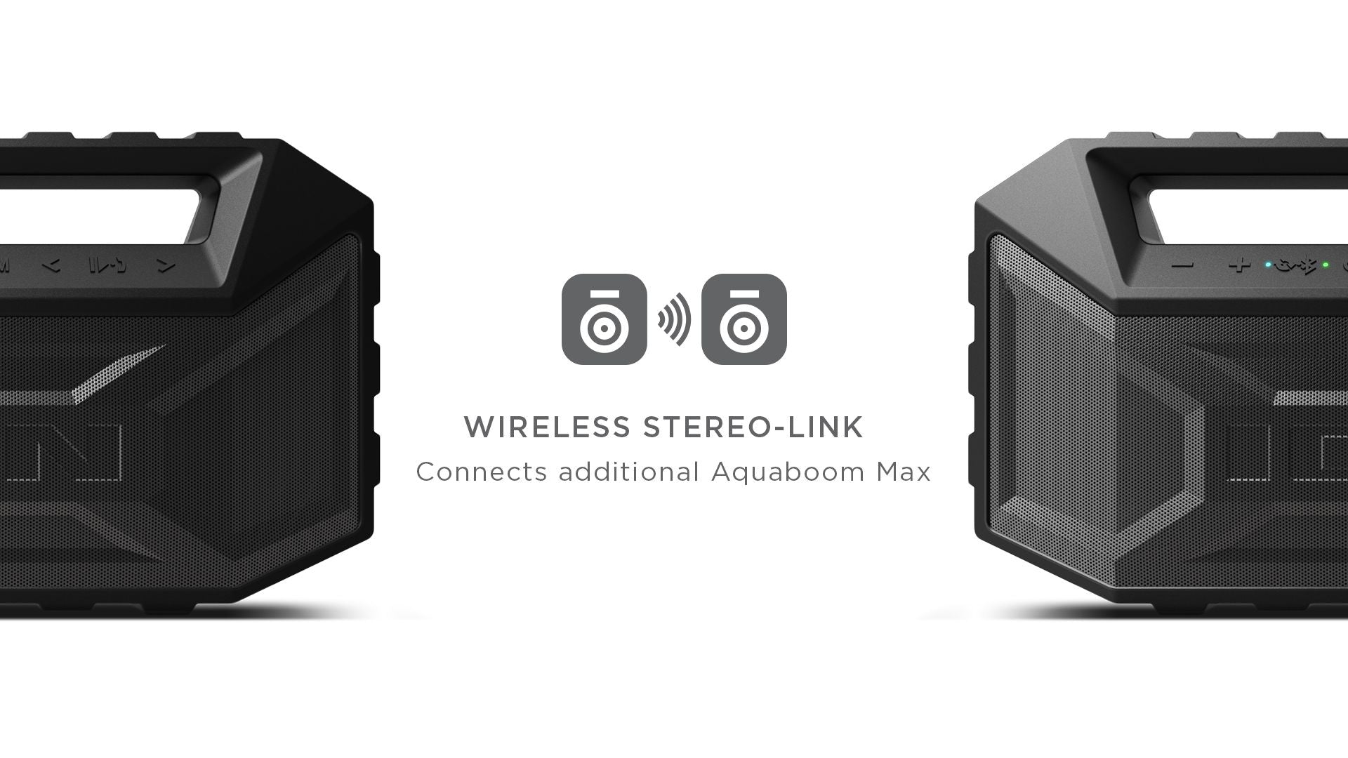 - Wireless Stereo-Link connects additional Aquaboom Max