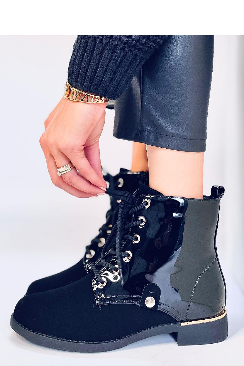 Women's lace-up boots - boots on a flat sole. They have a neat cut with striking lacquered inserts. They are traditionally laced, but additionally have a zipper on the side of the upper for easy putting on. The interior of the shoes is lined with soft fur. Outer material - ecological leather + ecological nubuck.