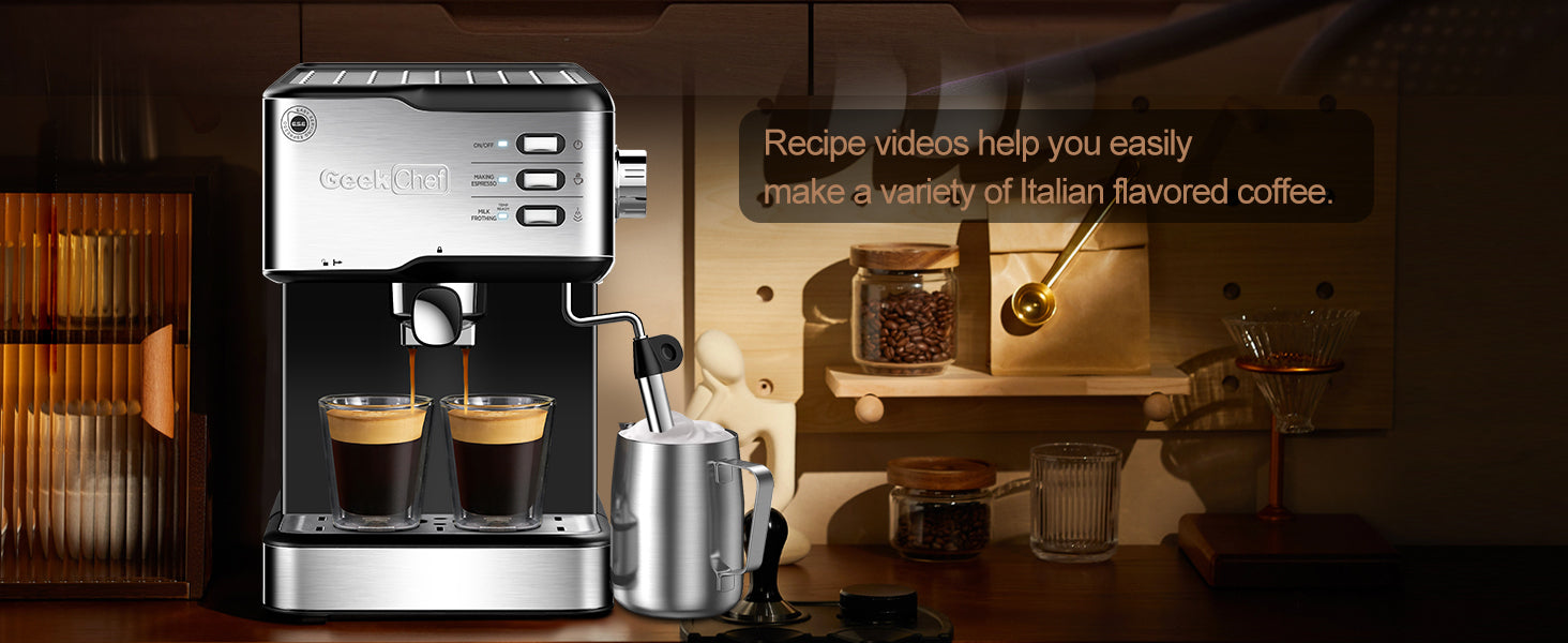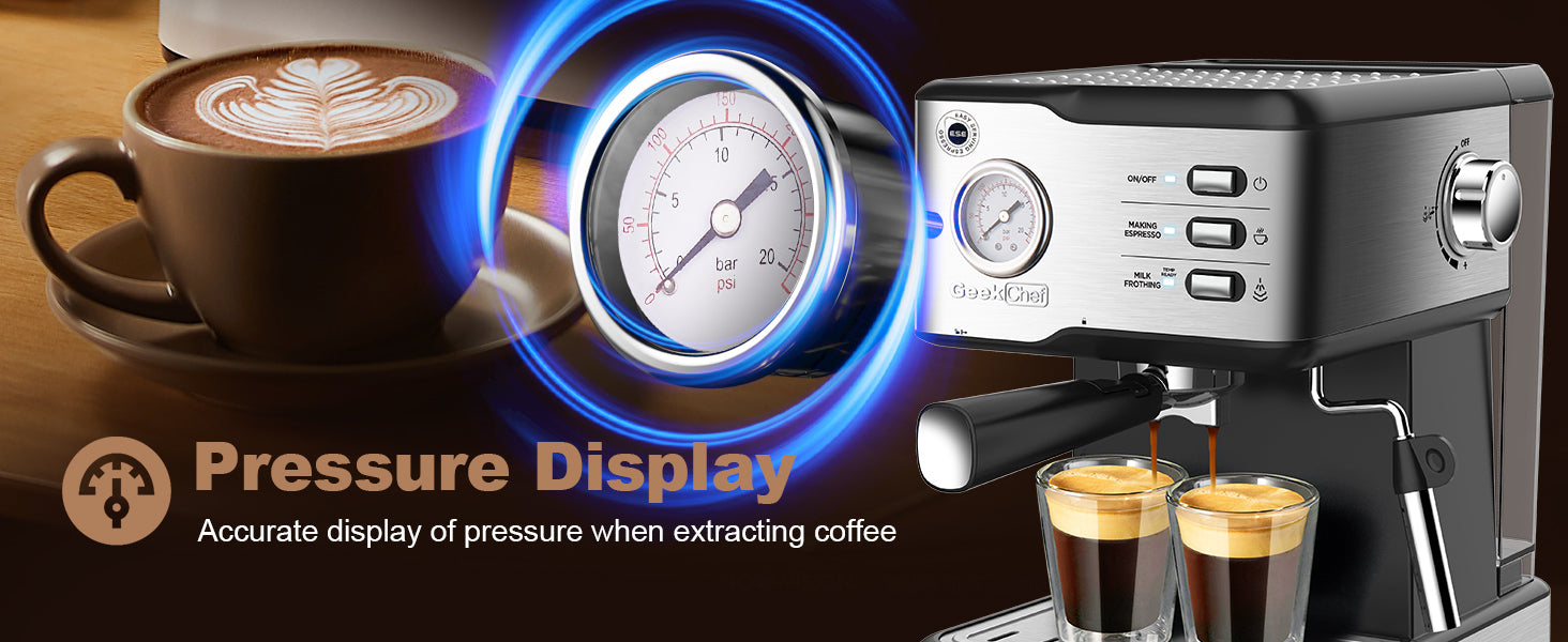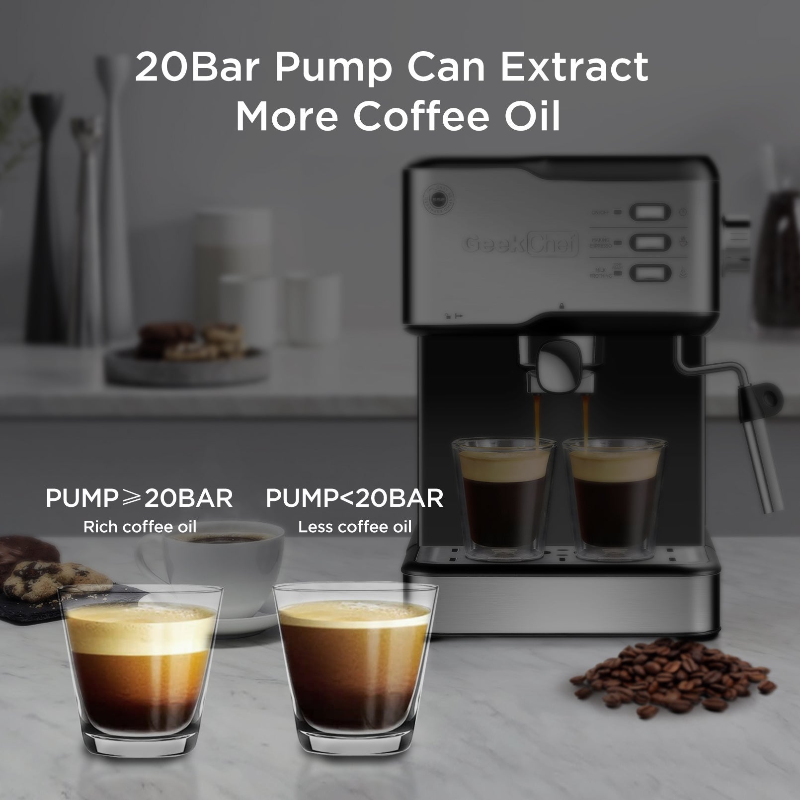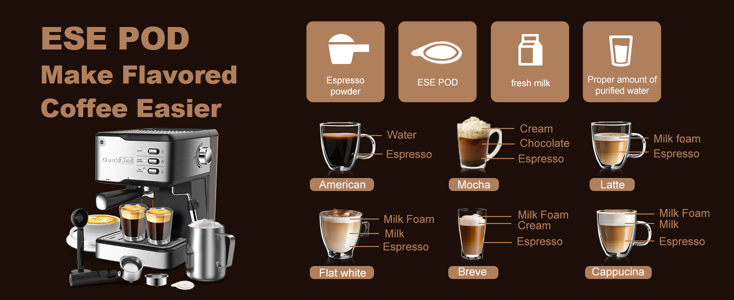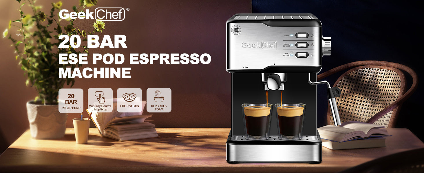 Geek Chef Espresso Machine, Espresso and Cappuccino latte Maker 20 Bar Pump Coffee Machine Compatible with ESE POD capsules filter&Milk Frother Steam Wand,950W,1.5L Water Tank Ban on Amazon