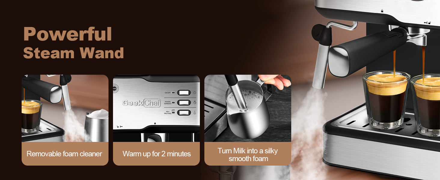 - ☕ PROFESSIONAL MILK FROTHING WAND: Frothing milk for cappuccino and latte by hot steam wand. The steam wand rotate degrees, which can produce silky and smooth milk foam better.