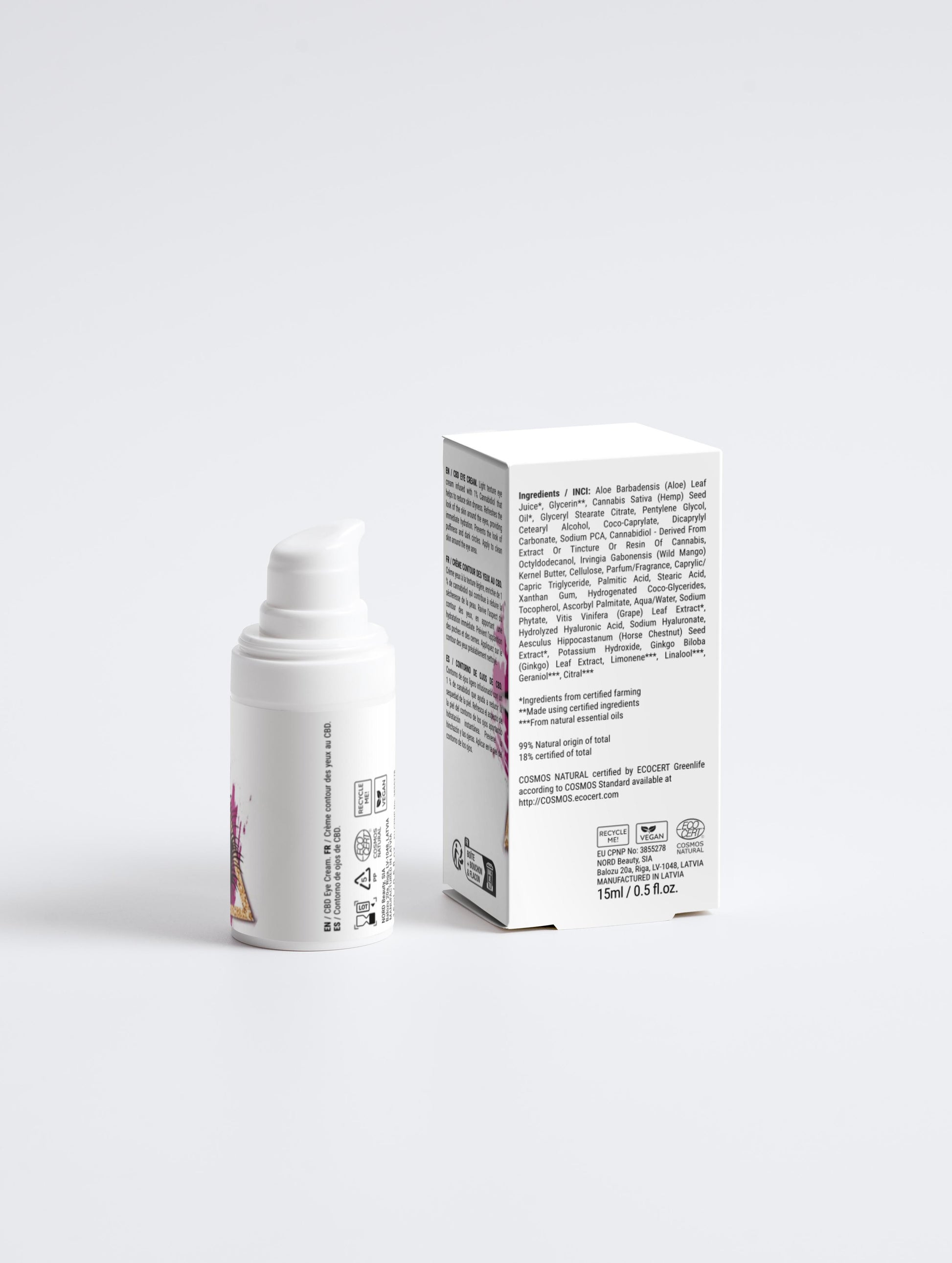 Perfect for dry skin, With cannabidiol, Prevents puffiness, face-care, Eye cream (Type), Gluten Free (Claims), Vegan (Claims), Natural Certified (Claims), Under-eye fatigue (Concern), Dry (Skin type), All skin types (Skin type), CBD (Active ingredients), Hyaluronic Acid (Active ingredients), Aloe Juice (Active ingredients)