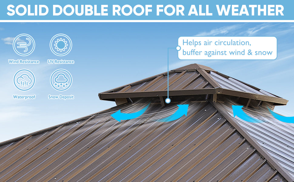 - This Hardtop Gazebo has vented double roof with netting connecting, which allows air to flow in and out rather than hot air trapped, this favourable ventilation system keeps cool even in hot summer