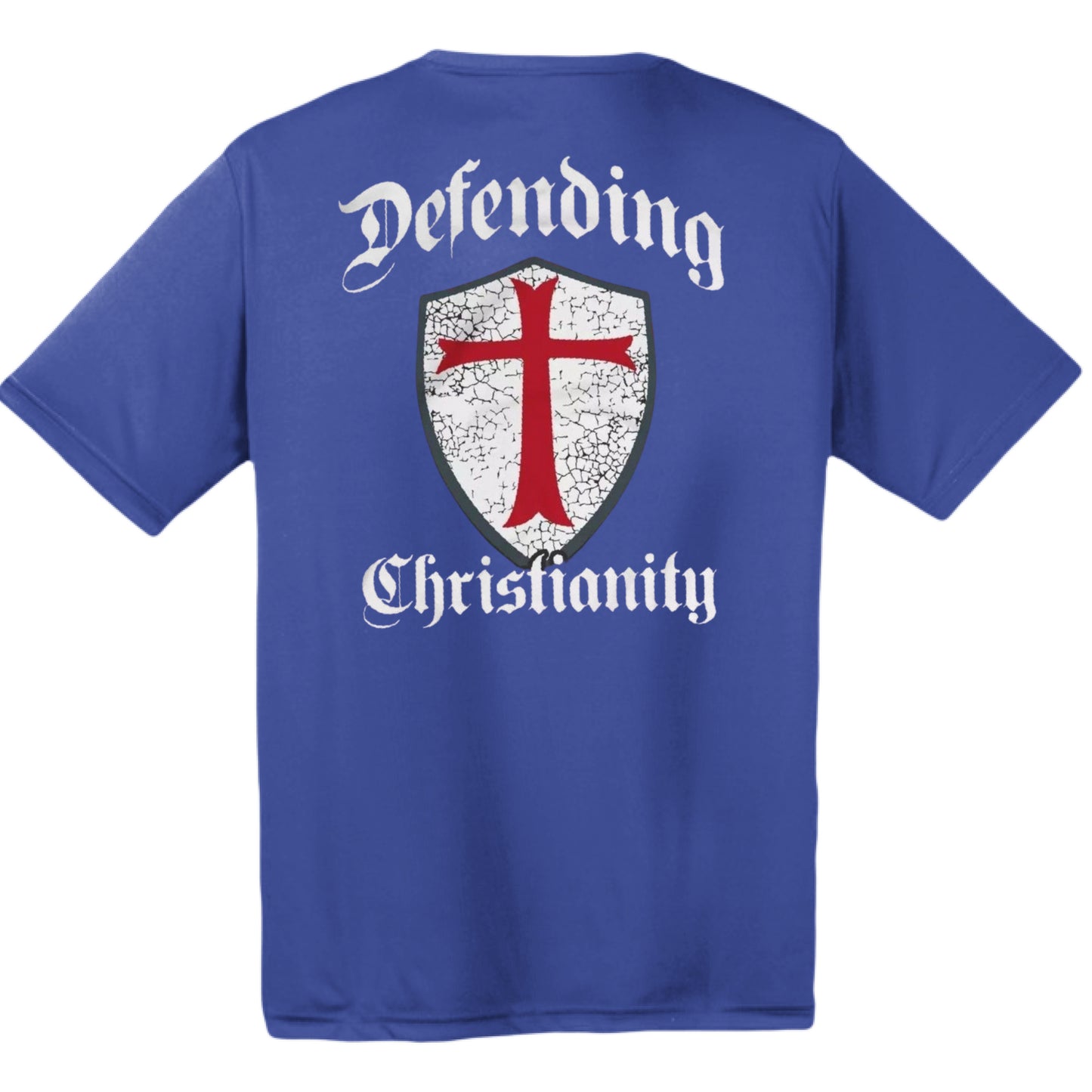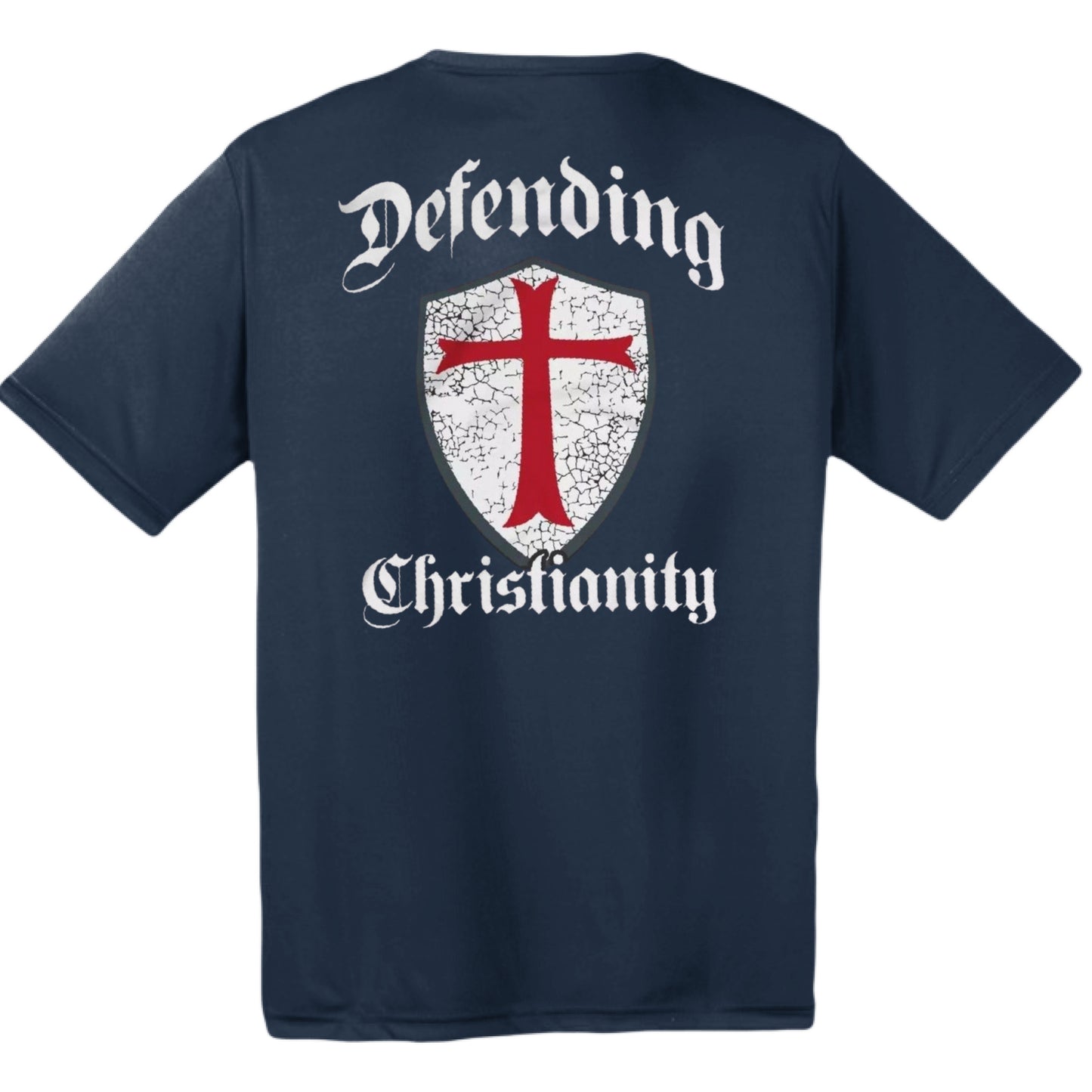 Stand strong in your faith with the Defending Christianity tee. Featuring a bold Roman shield emblazoned with a cross, this moisture-wicking PosiCharge® performance shirt is built for comfort and endurance—just like your commitment to the Gospel. Perfect for workouts, ministry events, or everyday wear that makes a statement.