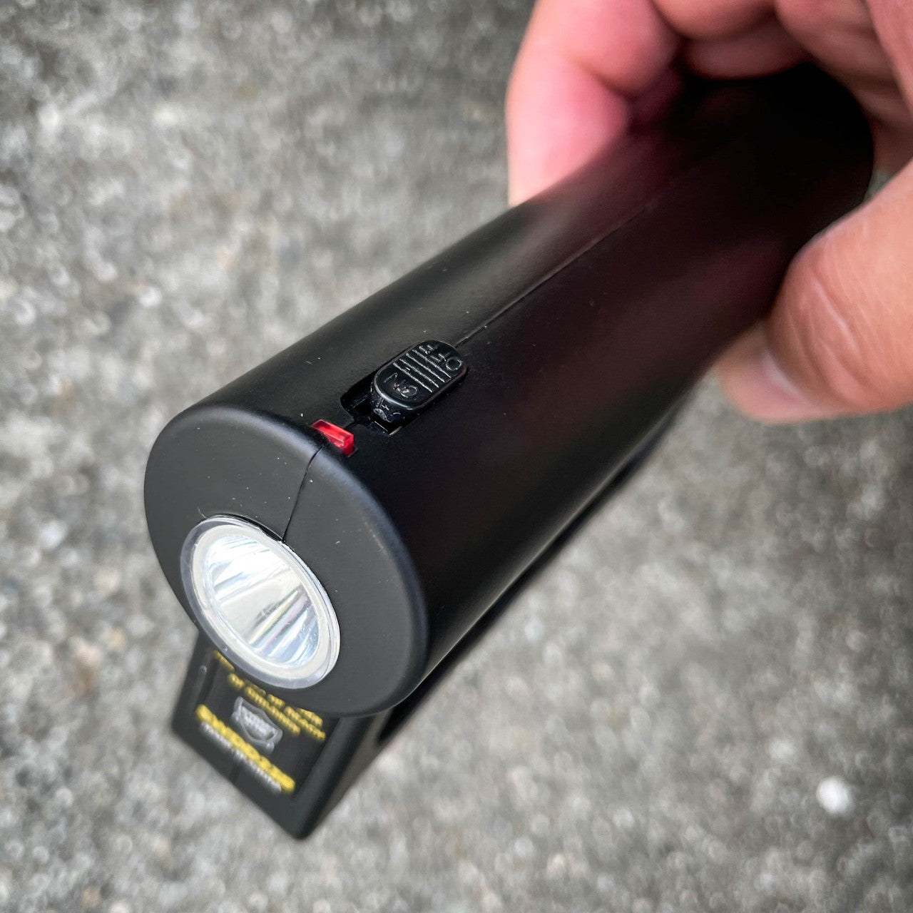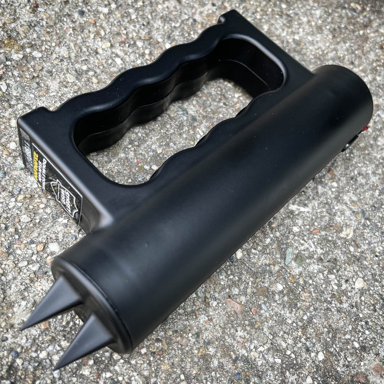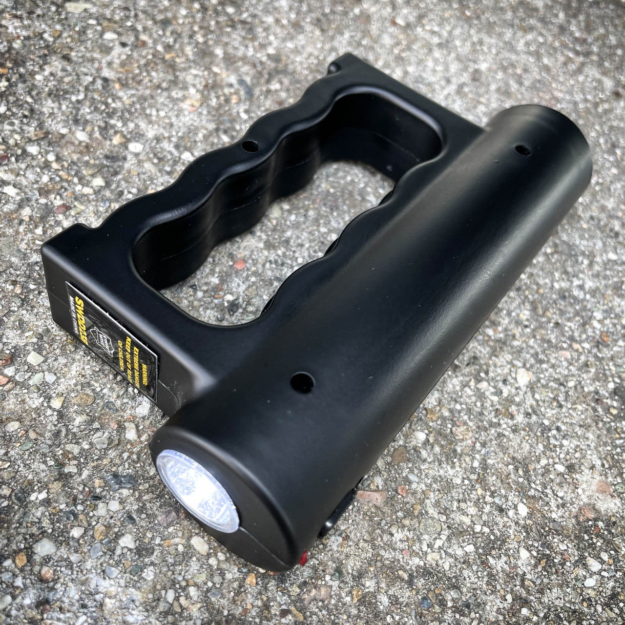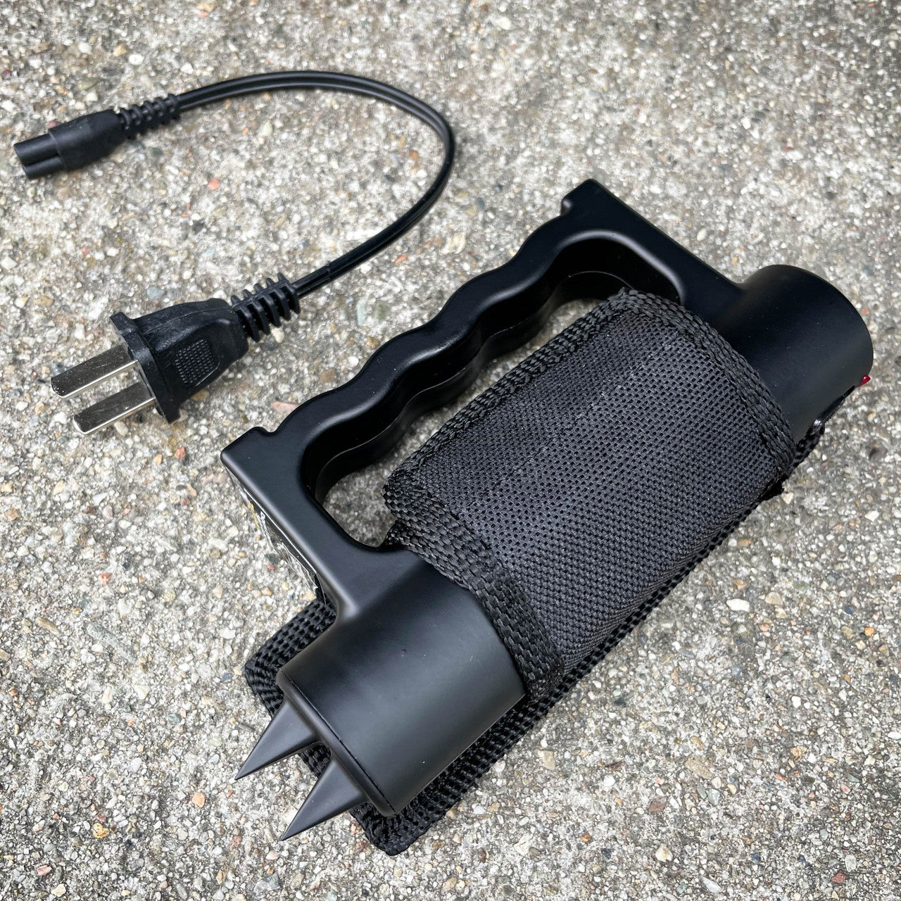 With its stun areas and self-defense spikes, it has never been easier to defend yourself! When carried with your arms down by your side the powerful flashlight faces forward to light your way safely at night. The bright light can also be shined in the eyes of a potential attacker. The self-defense spikes face backward, hiding them from a potential attacker and allowing you to “hammer strike” in a natural downward motion. Also, the top side of the unit is positioned over your knuckles to protect them when punching. Finally, the two stun areas can deliver a powerful electric charge and are positioned 4 inches apart to create a large stun area and eliminate the need for pinpoint accuracy when using the stun gun.