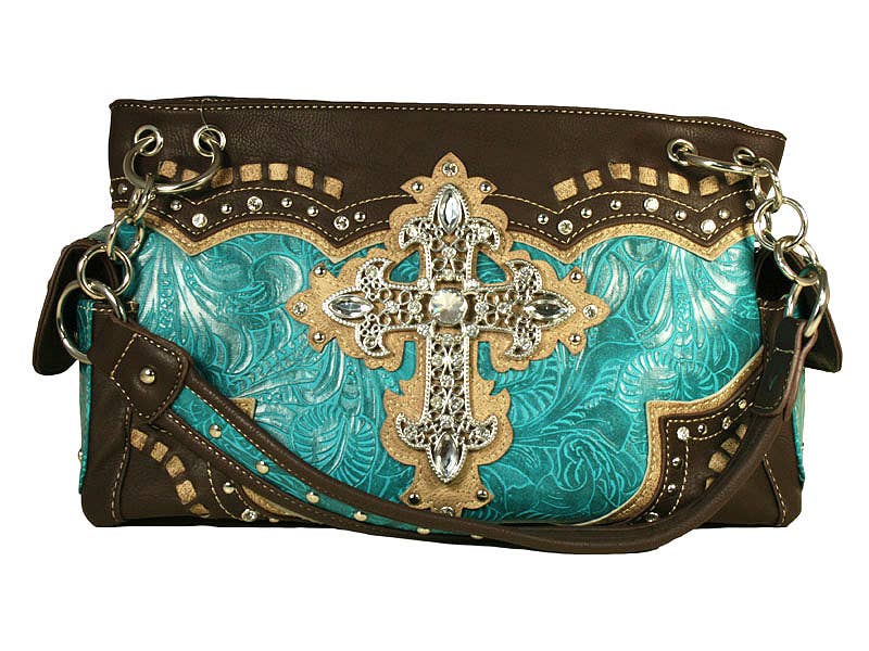 "Secure your safety without compromising on style with our conceal and carry purses." Fashion Conceal Carry Purse - Cross - Turquoise/Brown