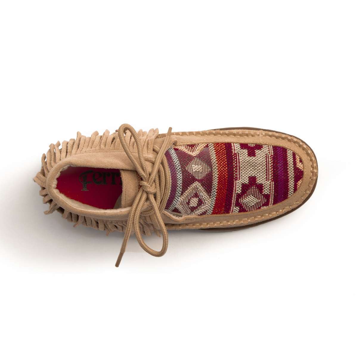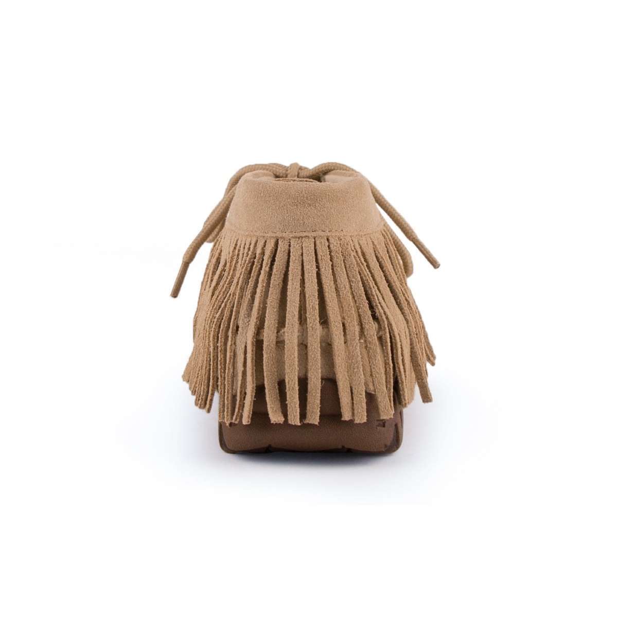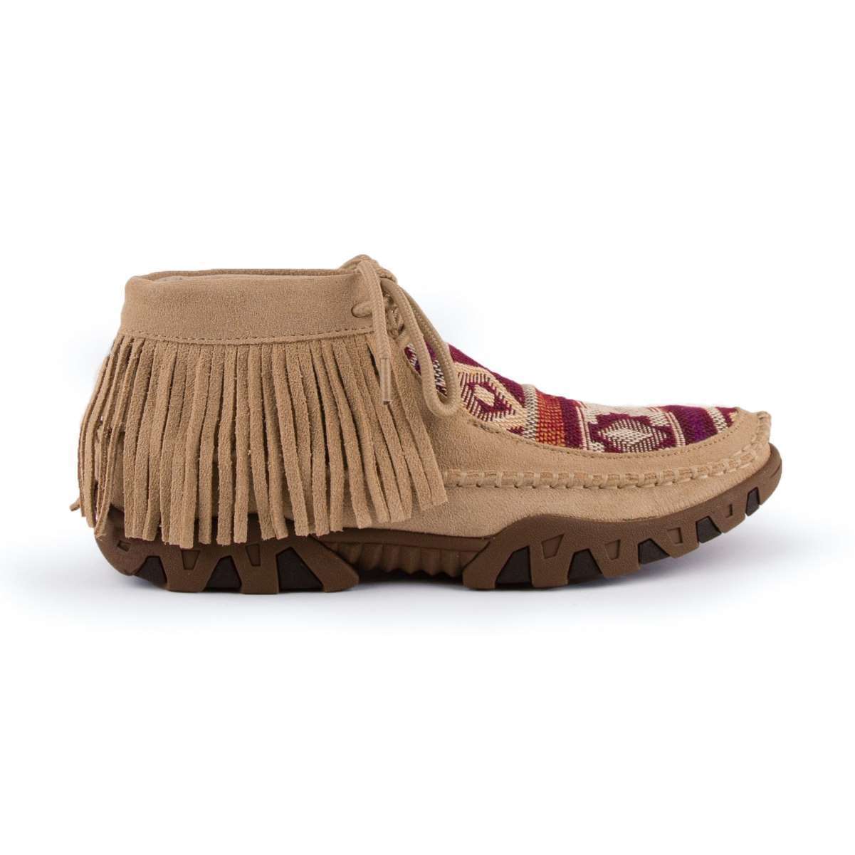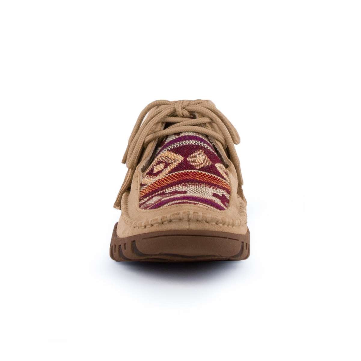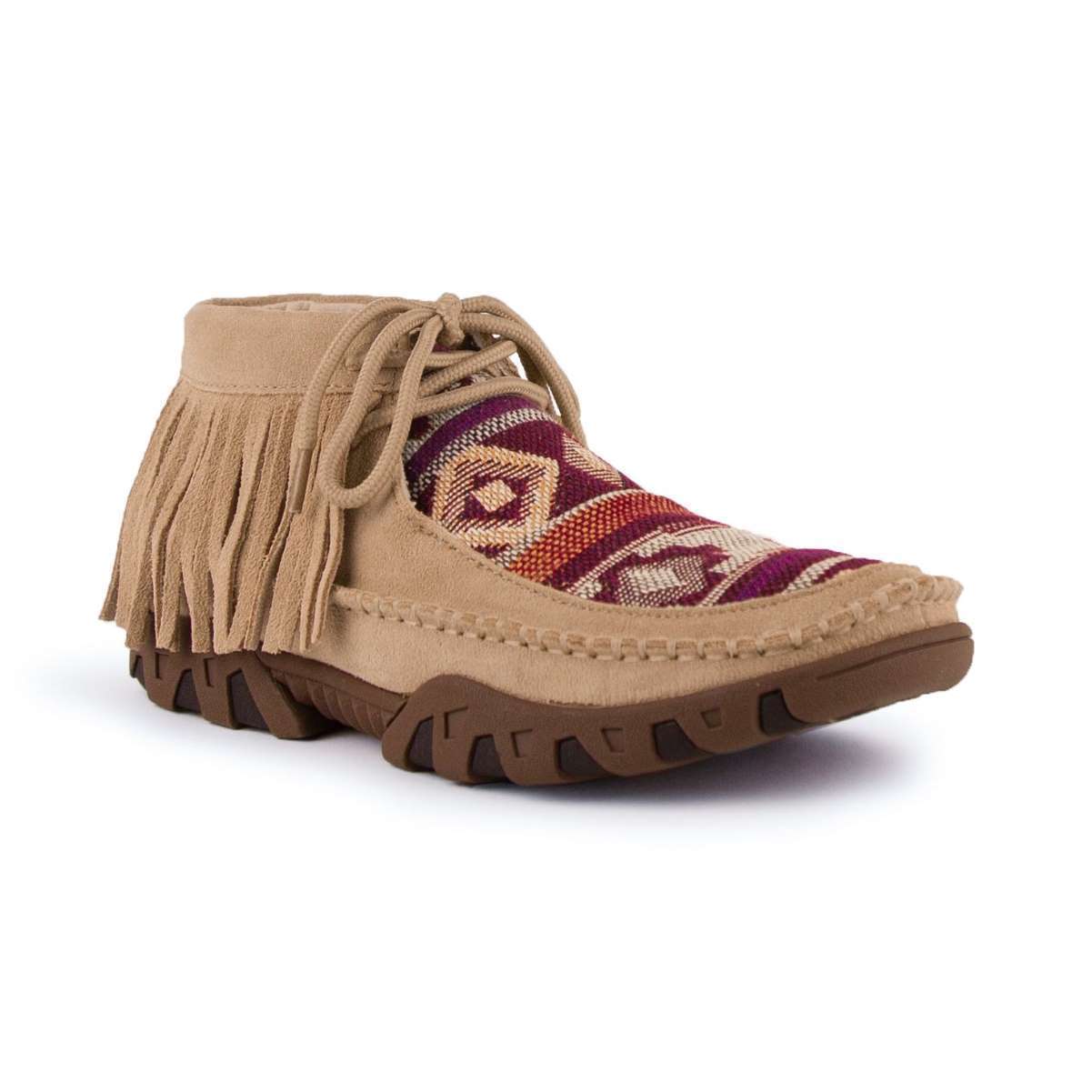 This trendy suede leather tan moccasin with a woven Aztec design and fringed detail is the perfect addition to any casual outfit. The flex sole and cushioned liner and insole give you the comfort of your favorite slippers.