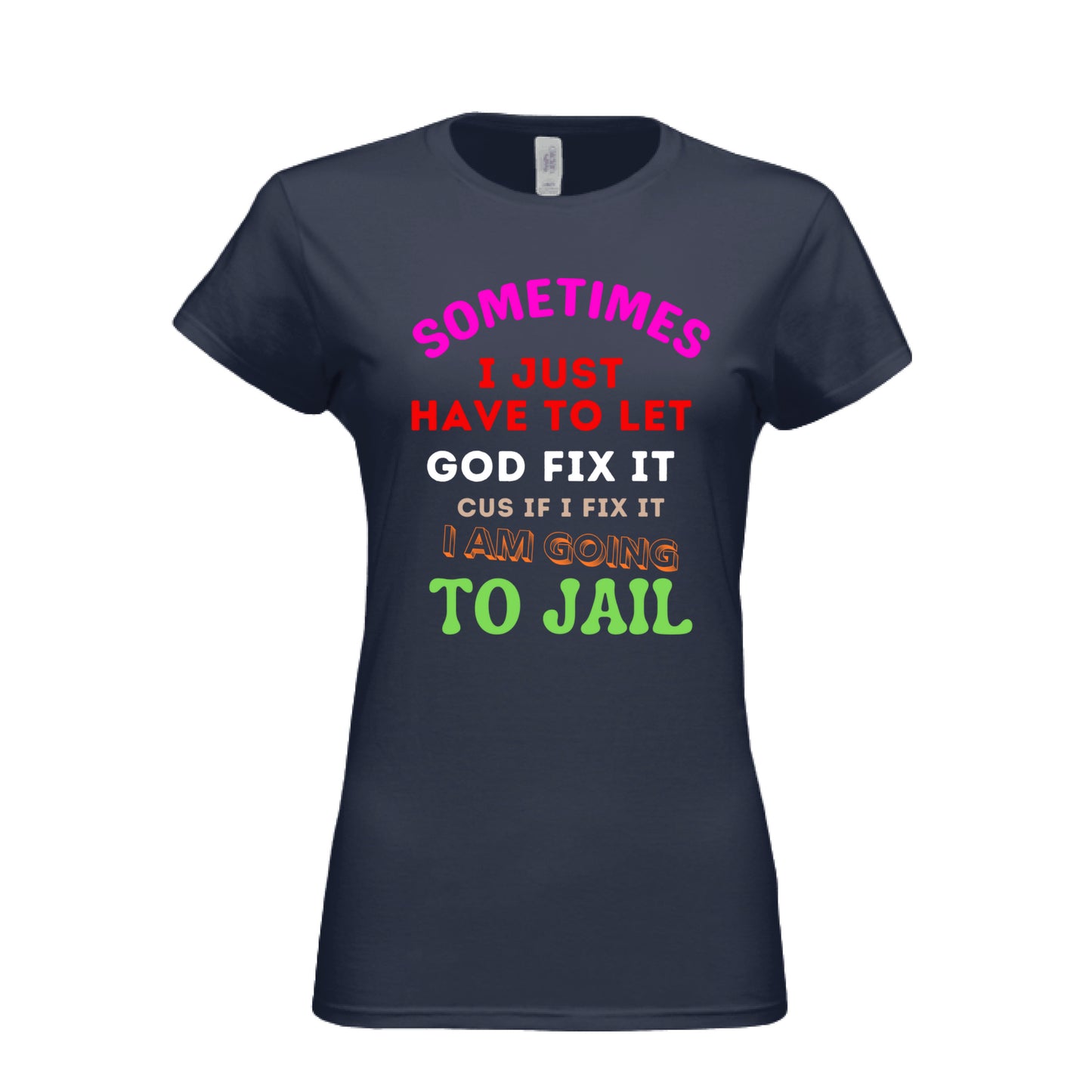 Keep it real and keep your peace with the “Sometimes I Just Have to Let God Fix It… Because If I Fix It, I’m Going to Jail!” tee. Made from soft, preshrunk cotton with a flattering fitted cut, this shirt delivers faith, humor, and a little bit of sass in one wearable statement. Perfect for those moments when prayer works better than bail money.