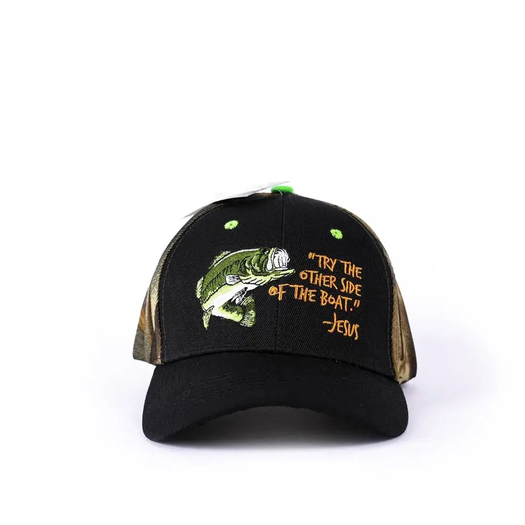 This black and camo cap features a Fishers of Men design, embroidered in orange, white, and shades of green, making it a perfect accessory for expressing your belief and adding a statement piece to any outfit.