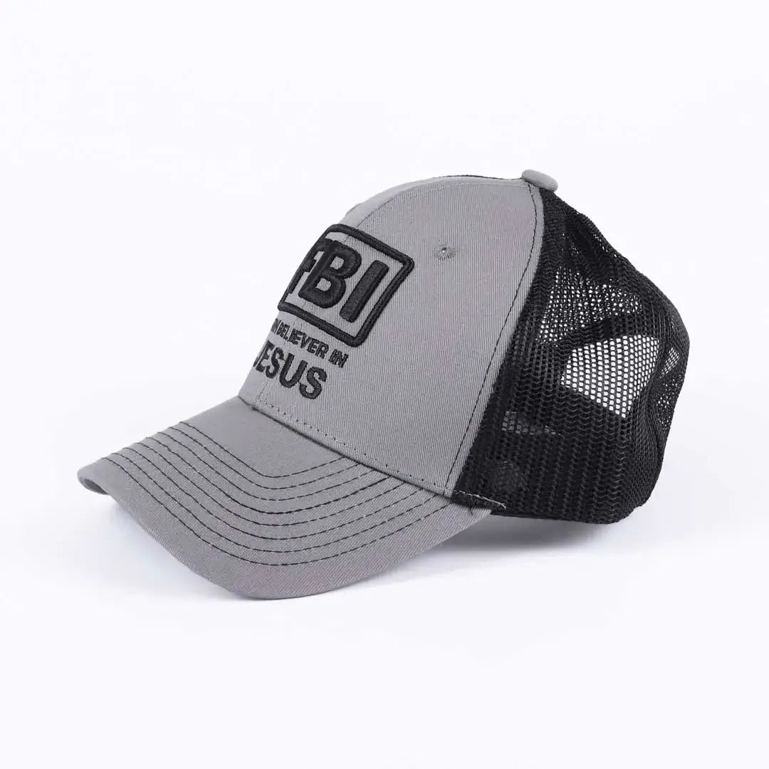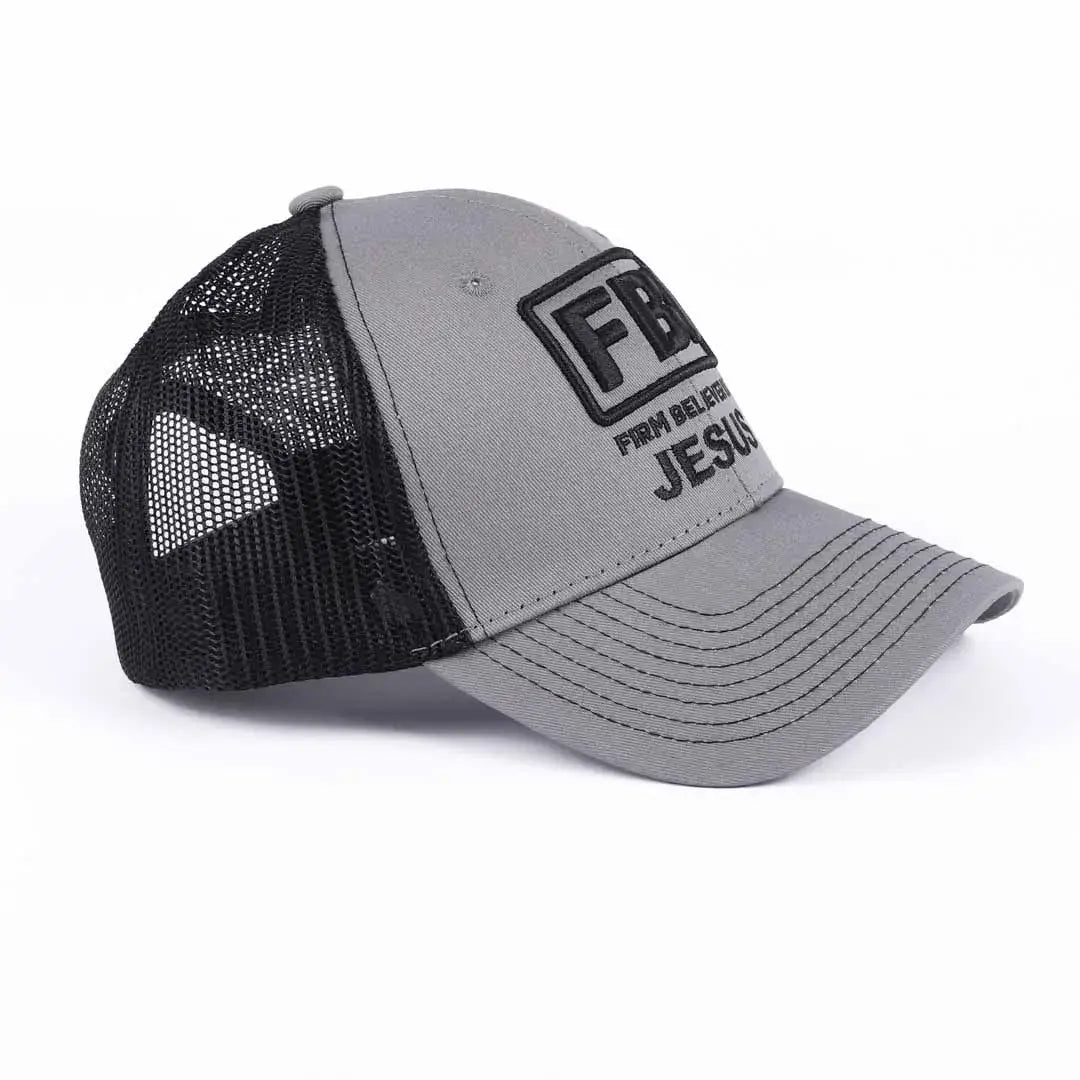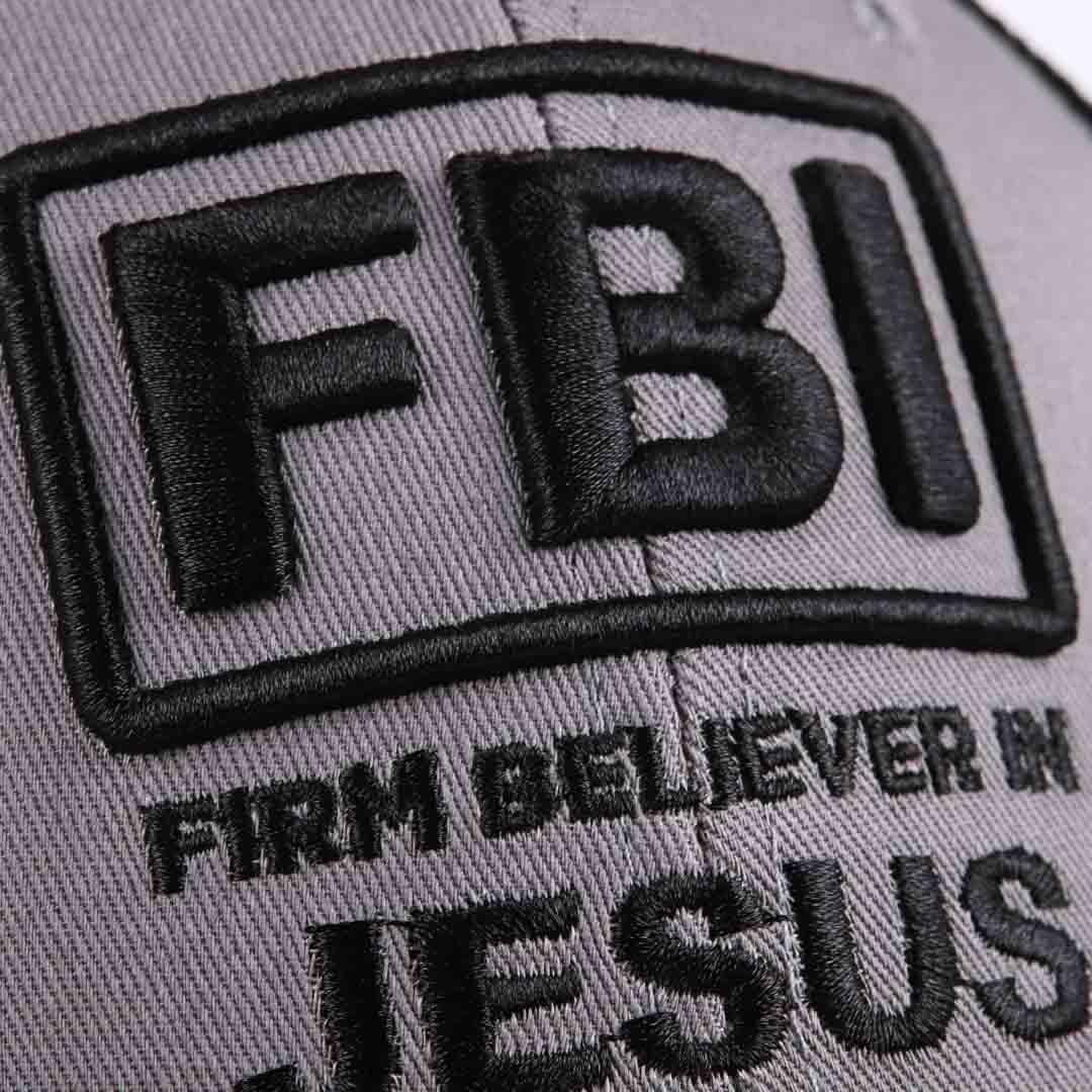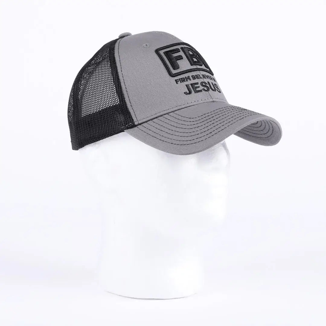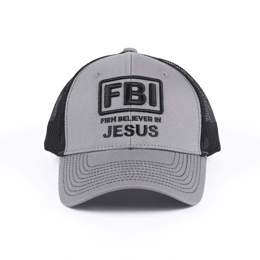 Designed with a warm grey front panel and a breezy black mesh back, this cap strikes the ideal balance between a classic aesthetic and modern flair. The centerpiece of this cap is the intricately embroidered design proudly displaying the phrase "FBI, Firm Believer in Jesus" in bold black against the soft grey backing. The detailed embroidery not only adds texture and definition but also lends a touch of individuality and style to your look.