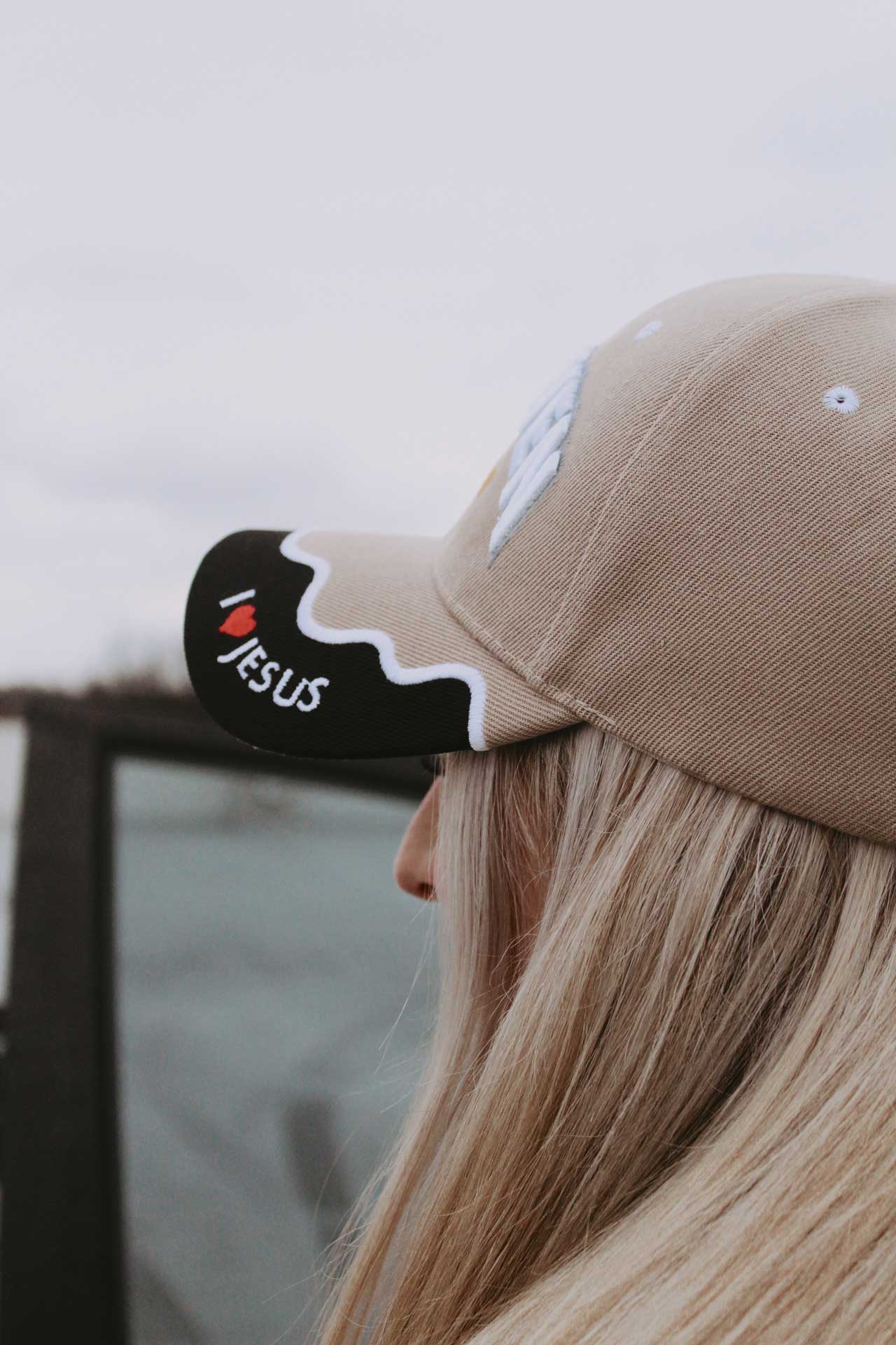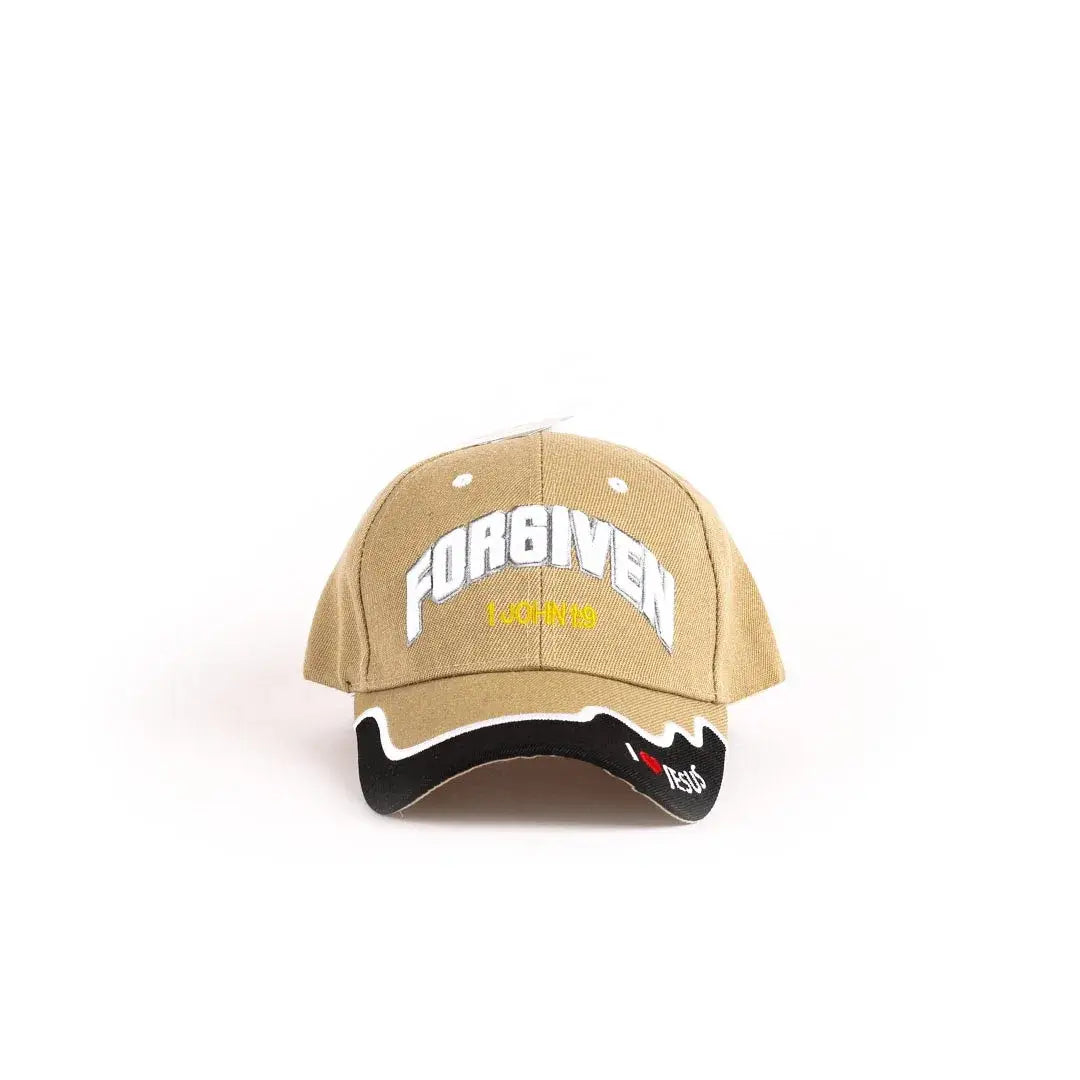 This khaki and black cap is adorned with a "Forgiven" 1 John 1:9 design, plus an "I Love Jesus" message on the bill and back. Embroidered in white, grey, and gold, this cap is a perfect accessory for expressing your beliefs and adding a statement accessory to any outfit.