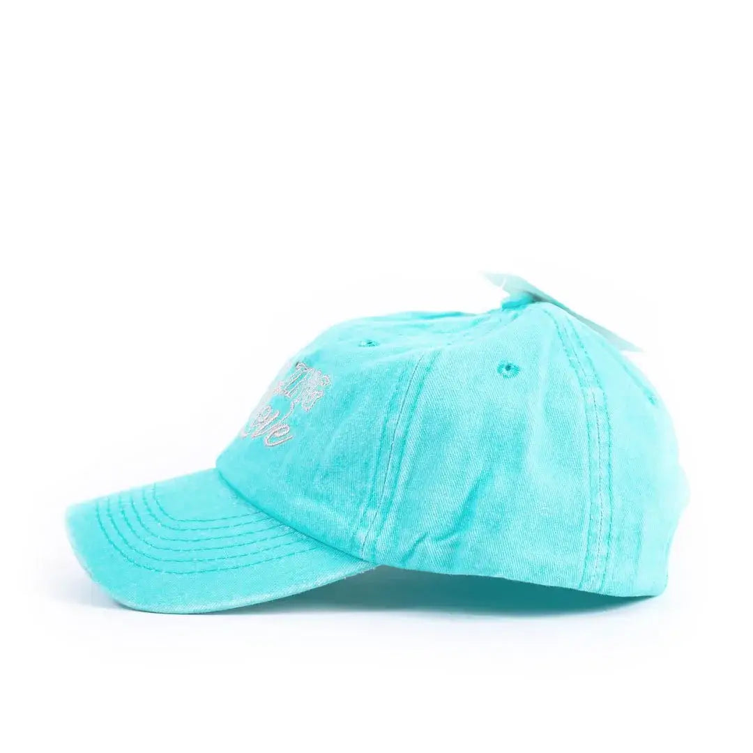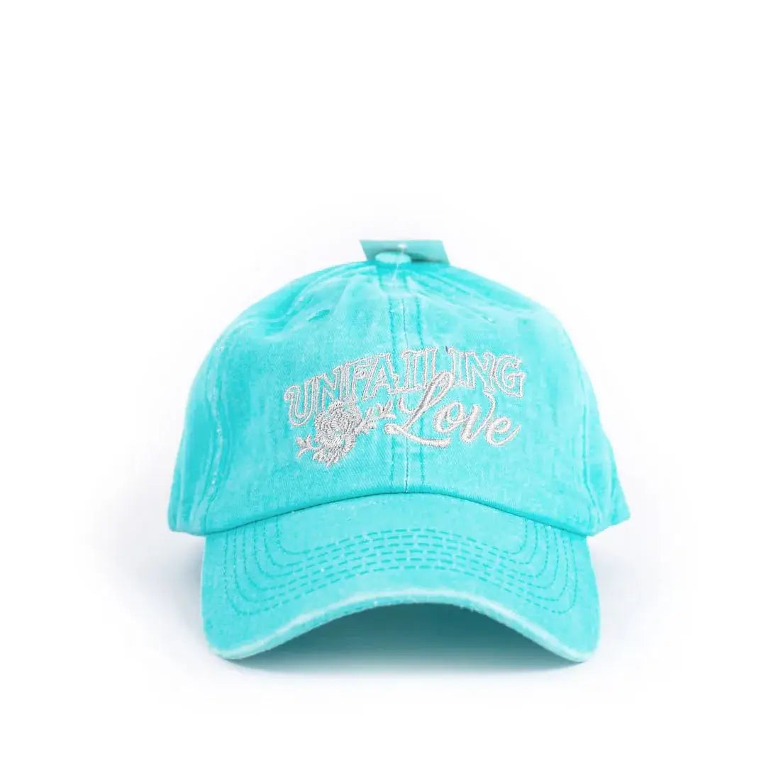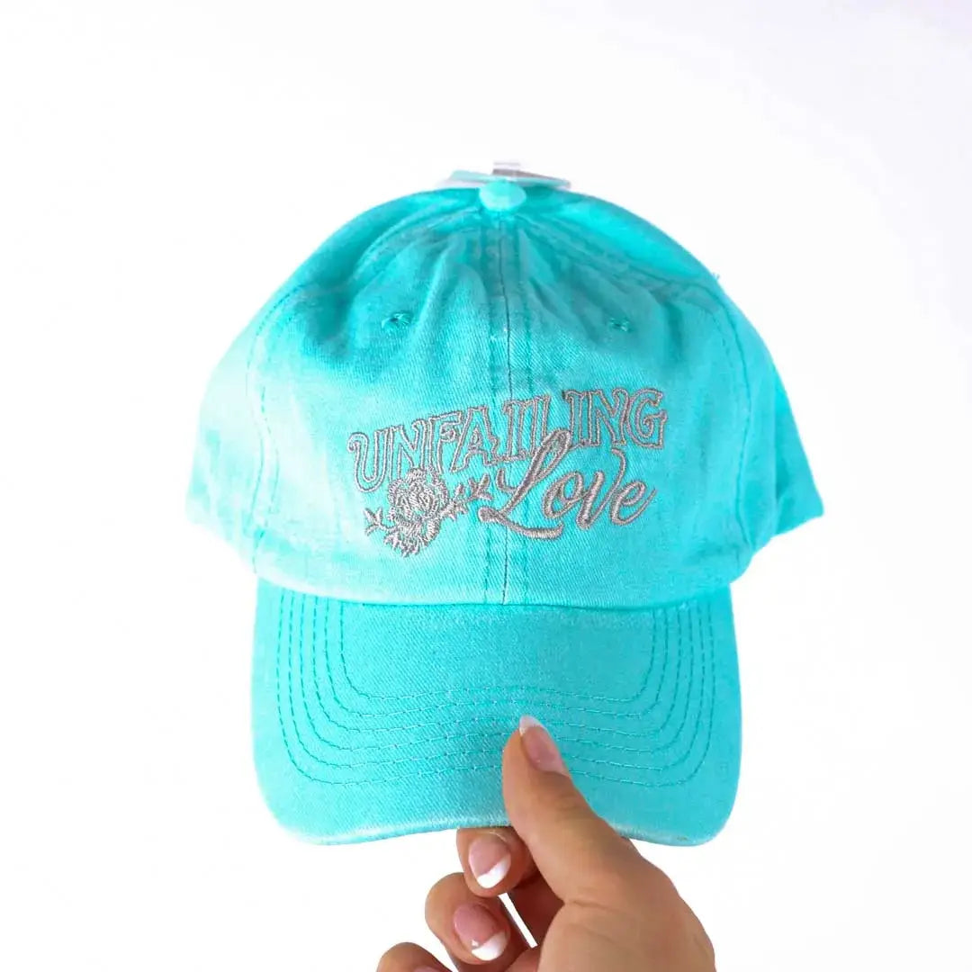 This turquoise cap is adorned with a beautiful Unfailing Love design, which is embroidered on with a soft grey, making it a perfect accessory for expressing your belief and adding a pop of color to any outfit. The embroidery work is done intricately and carefully, ensuring that the design lasts for a long time without fading or tearing.
