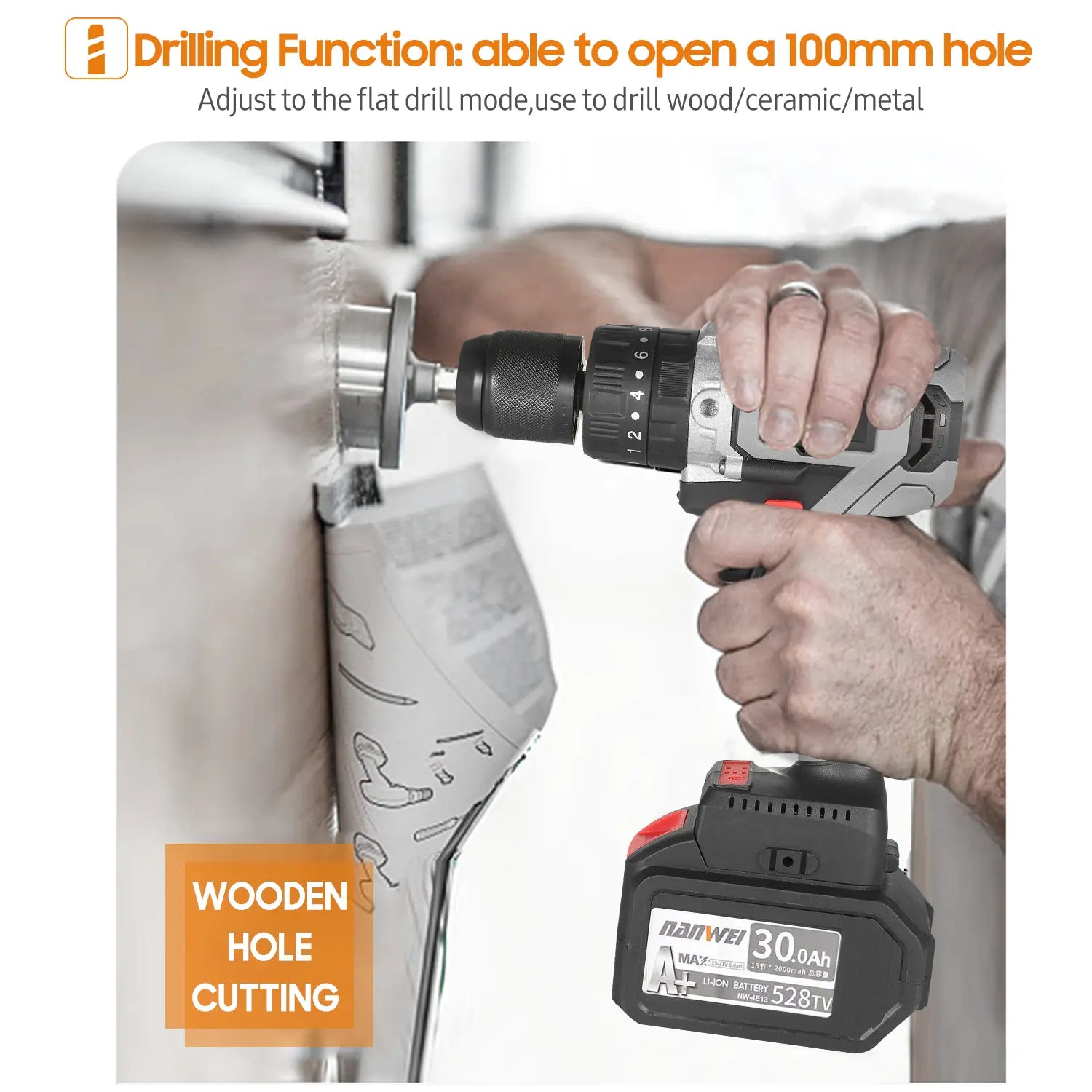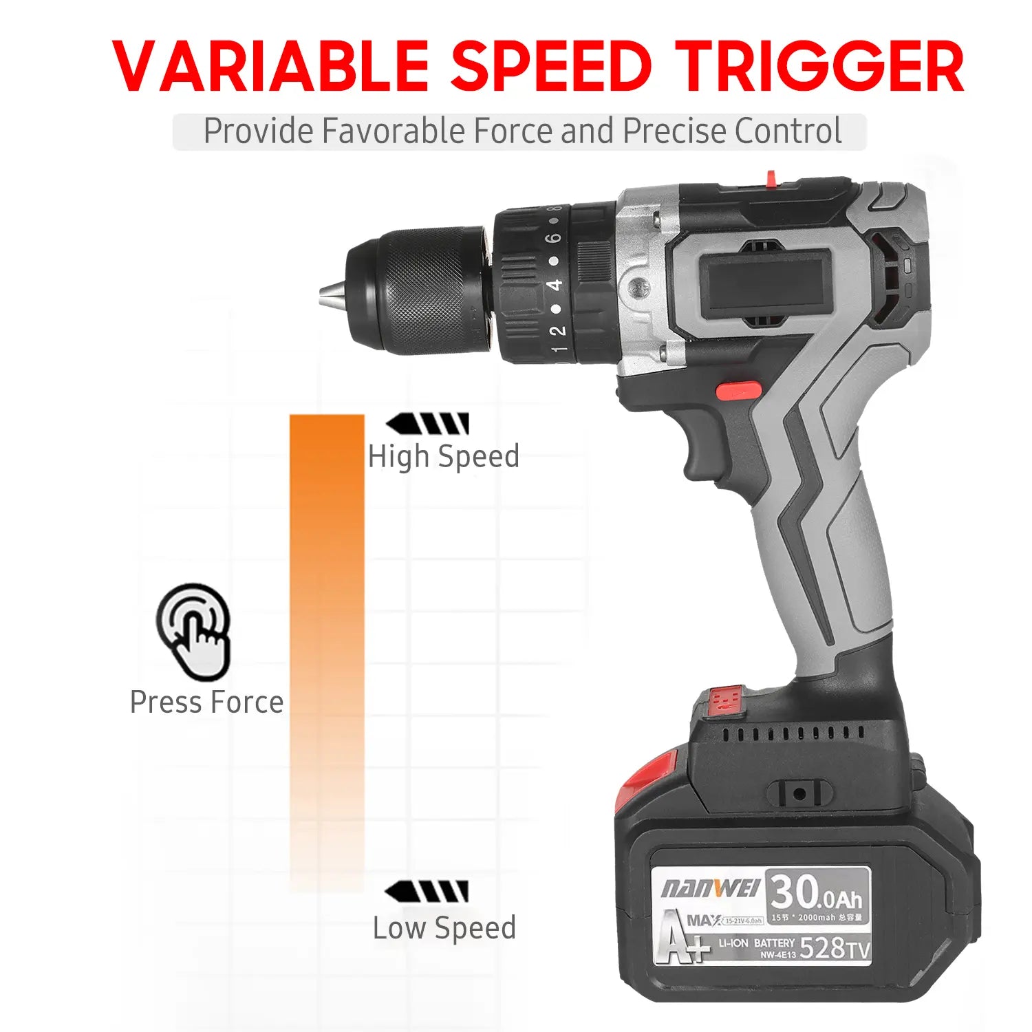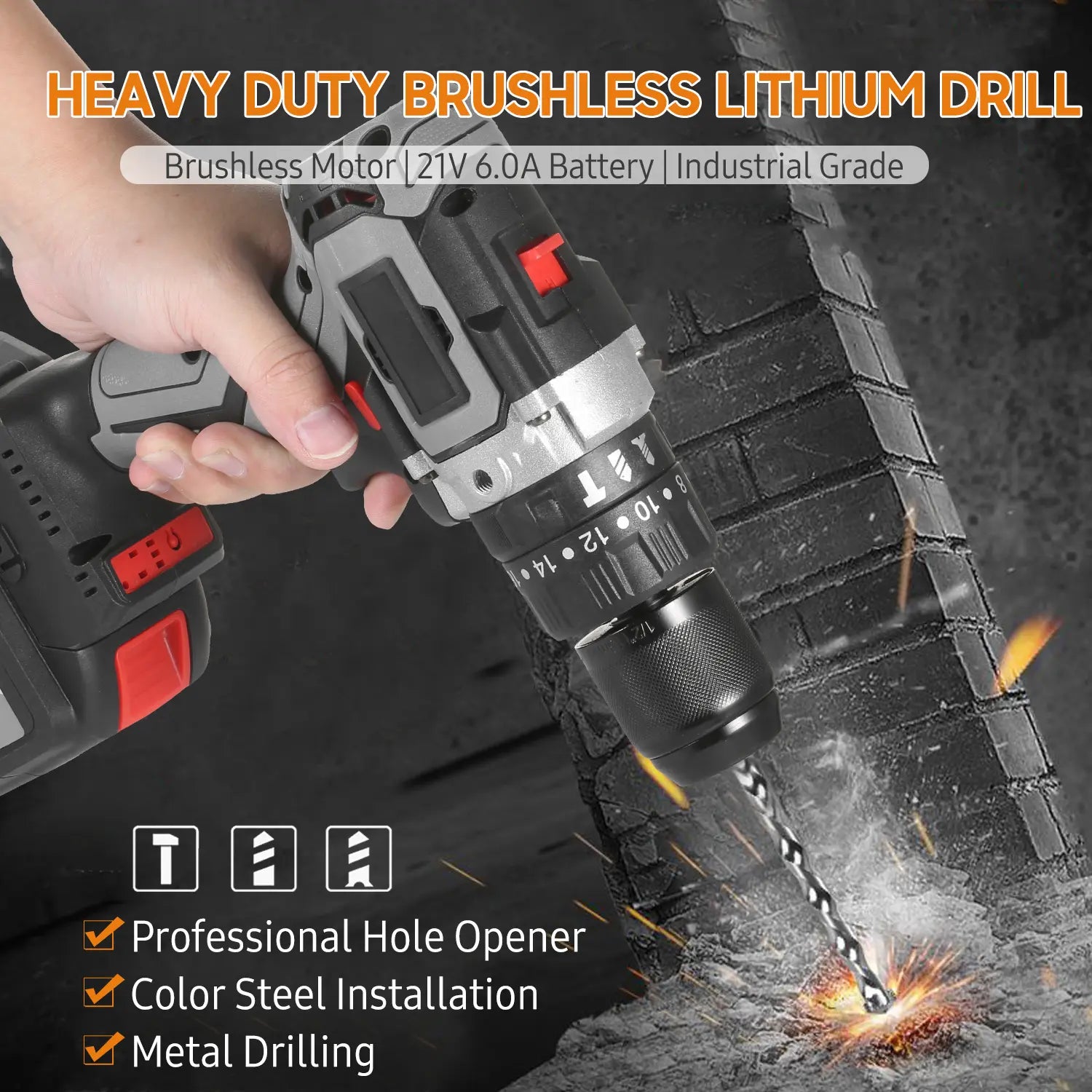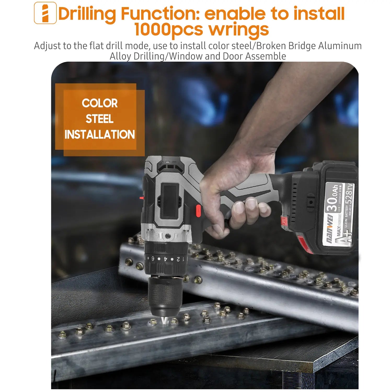 Industrial grade cordless drill driver with brushless motor can deliver up to 200Nm (2,655 inf)impact power, which is 10 times more then the majority drill driver in the market. 2-Speed drill with 23 clutch position for Flat drill/Kai wring/Impact, variable speed controlled by different press for ce, suit for color steel installation, metal drilling, opening 100mm large hole for wood, etc.