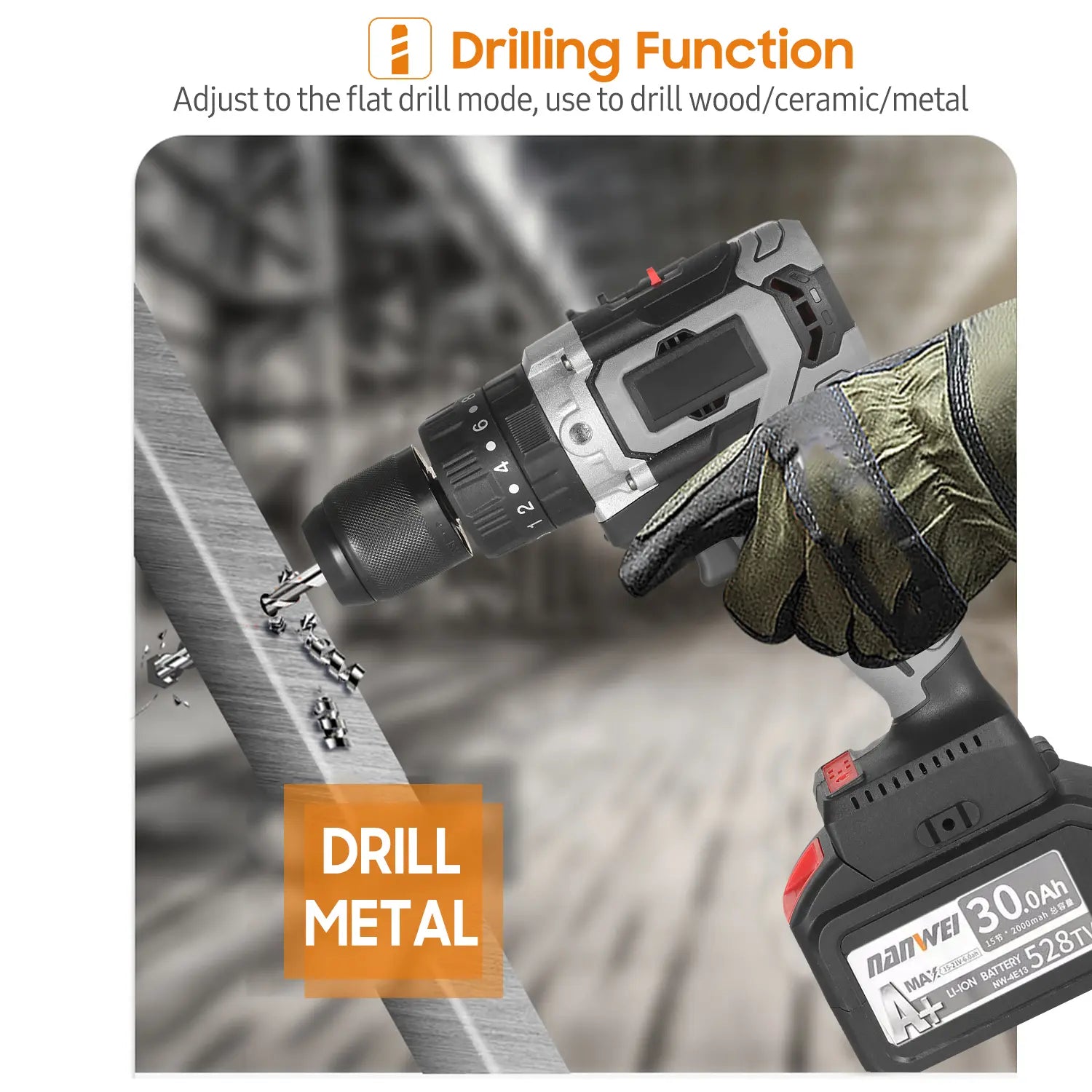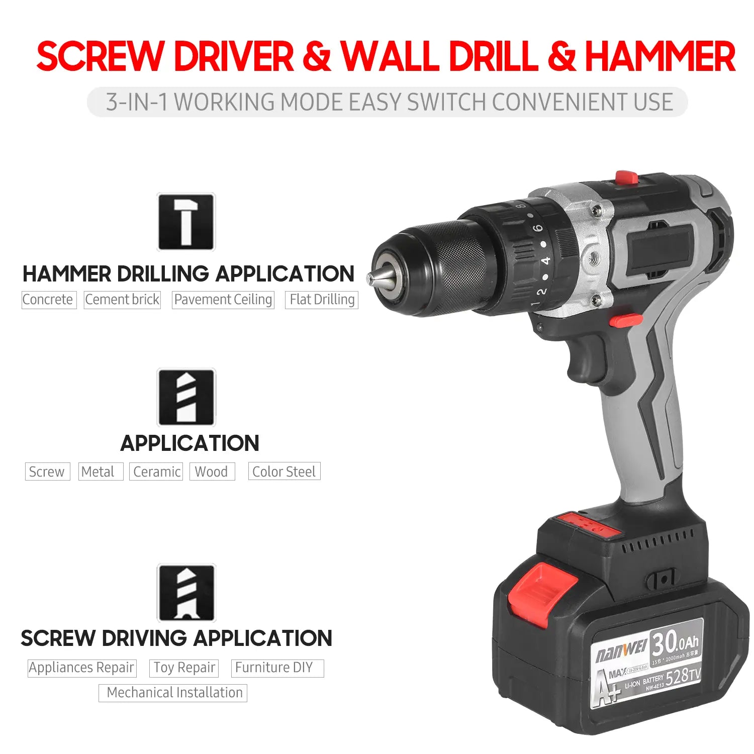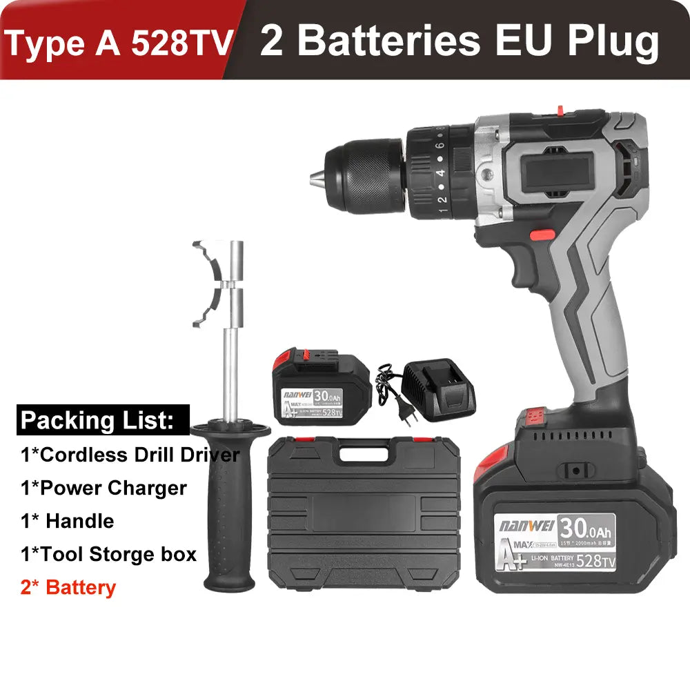 Home Cordless Electric Drill Driver 21V 30A Batteries Max Torque 200N.m Variable Speed Impact Hammer Drill Electric Screwdriver