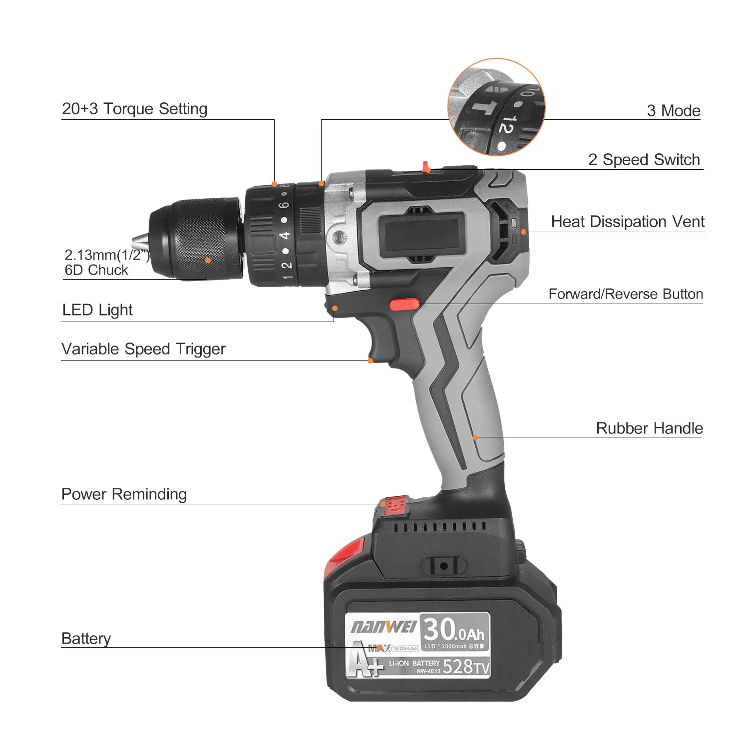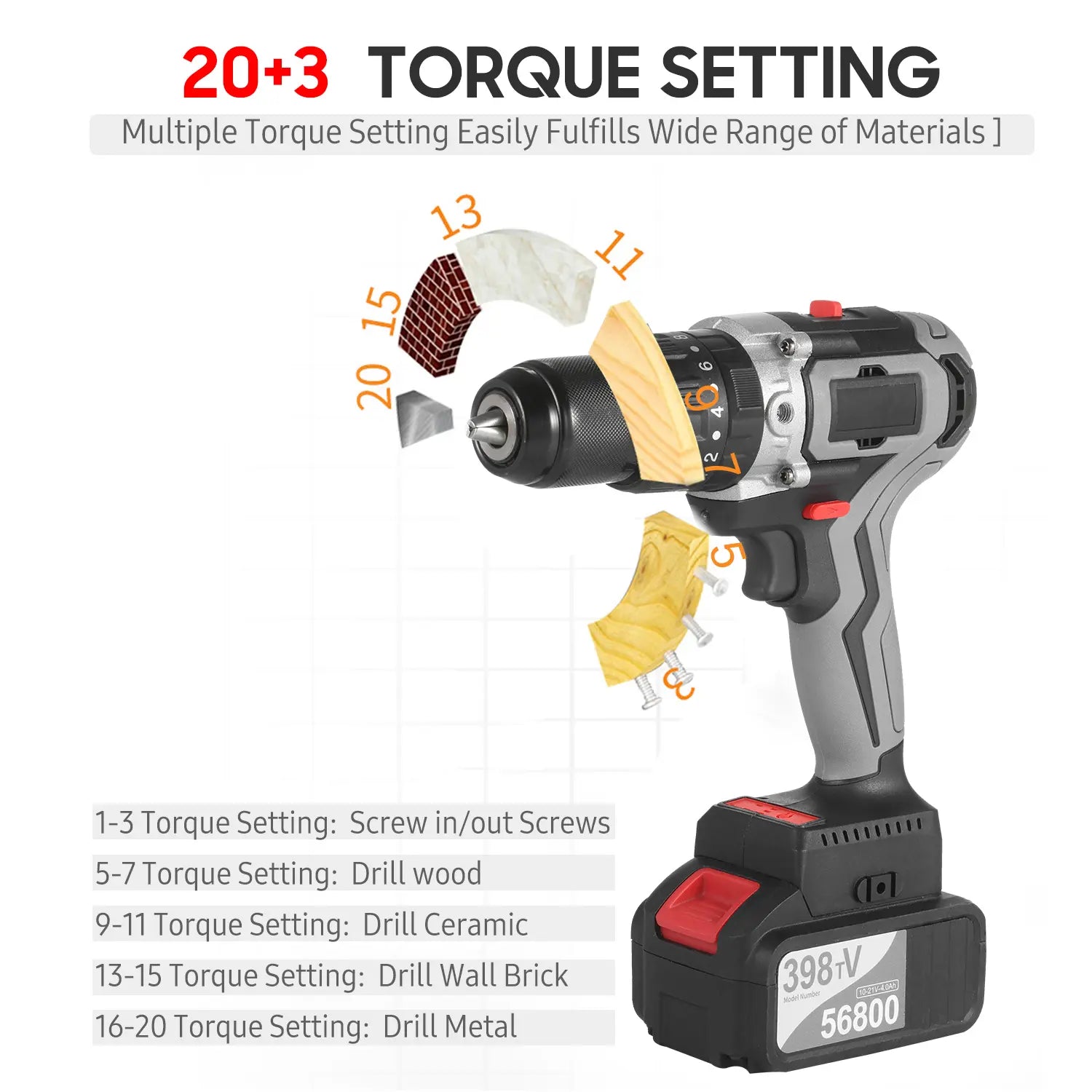 23 Position Clutch & 2 Variable Speed -- 20+1+1+1 torque settings, 2 speeds(0-450RPM/0-1550RPM) adjustment, variable speed trigger and forward/reverse switch provide favorable forc e and precise control for driving in/out screws to prevent stripping, and drilling into wood, plastics, ice, metal and colorsteel with ease. Low torque with first speeds for screws driving and wood drilling. High torque with second speeds for wall drilling and hammer functions.
