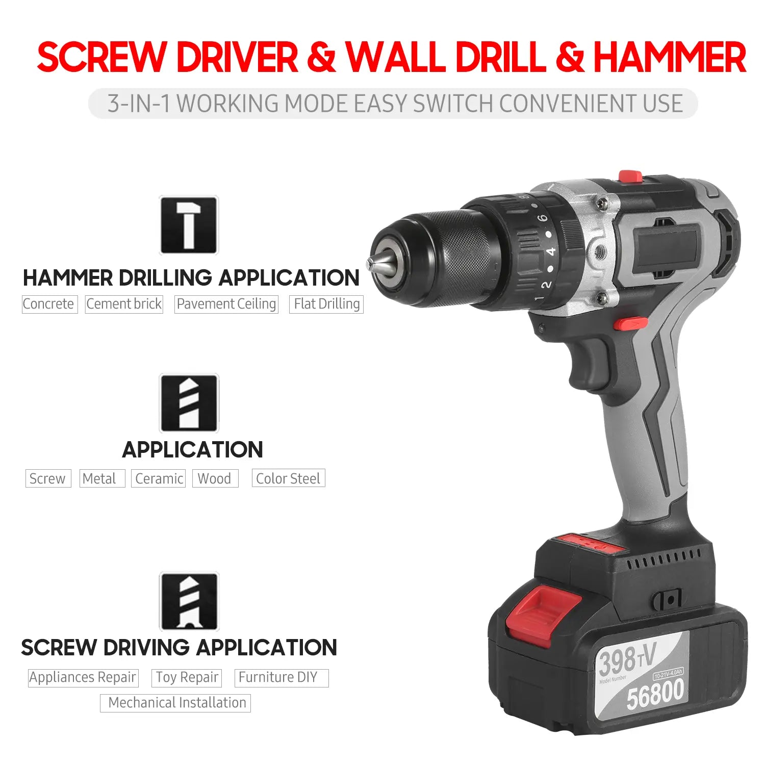 Ergonomic Industrial Grade Impact Drill -- The compact drill with a soft rubber handle provides a comfortable grip for being breezily operated in one hand and perfectly reduce fatigue for long time use and easy access to tight areas. Come with an auxiliary handle to help you do heavy duty working, such as drilling a 1.25 meters thick ice holes. Screw Driver & Wall Drill & Hammer 3-in-1 working mode enable you to deal all works from light to heavy duty.