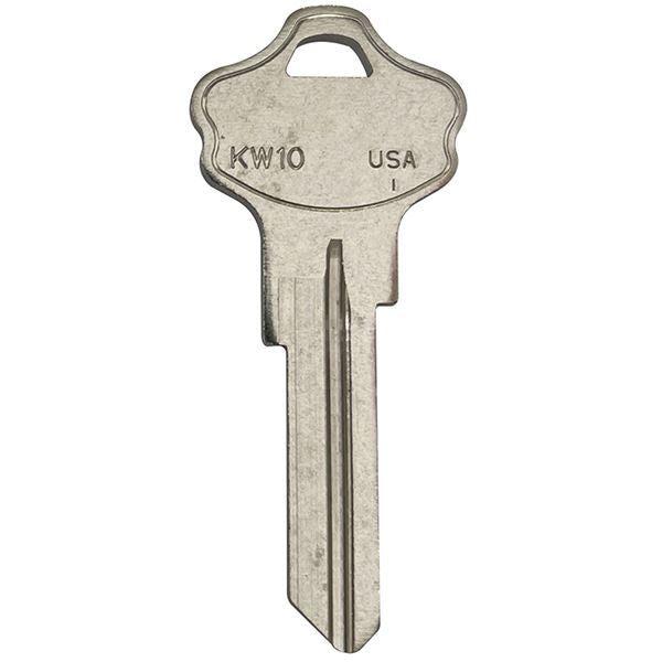 • These Kwikset KW10 key blanks are constructed of solid brass, and they come in a polished finish. These key blanks are for use with Kwikset UltraMax locking hardware. Take to lock-smith to be cut.
