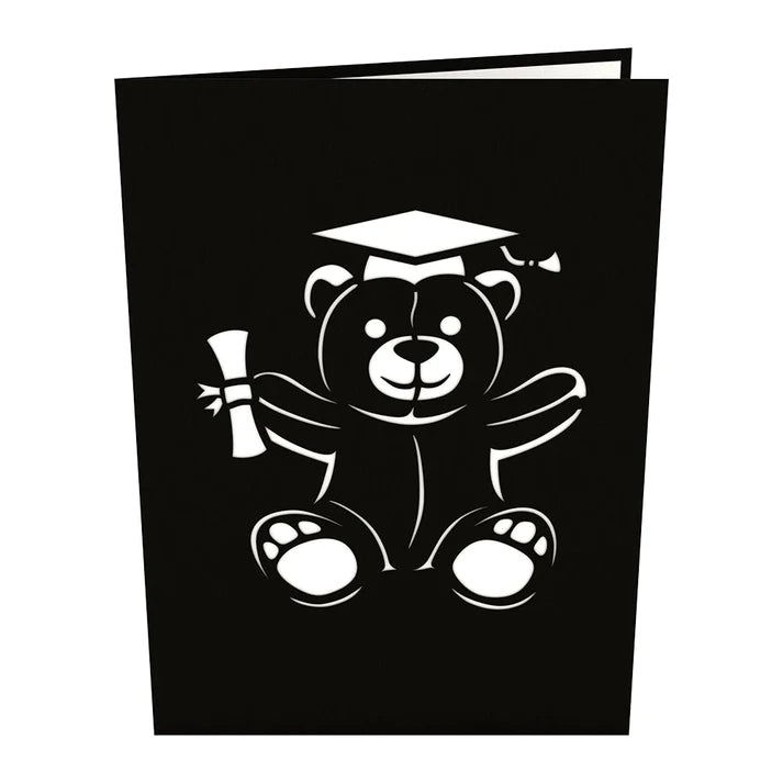 The black cover of this great graduation card features our favorite teddy bear. He is smiling, wearing a mortarboard, and holding a diploma.
