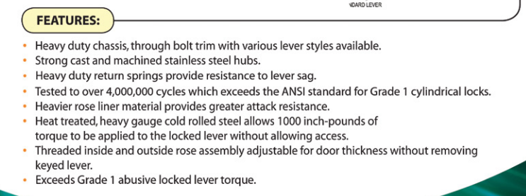 - Tested to over 4,000,000 cycles which exceeds the ANSI standard for Grade 1 cylindrical locks.