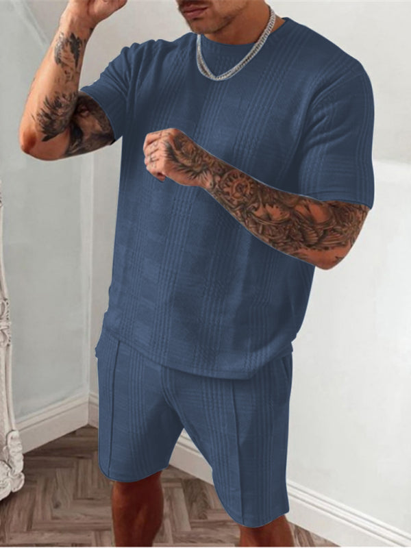 Muscle Hugging Men's casual plaid short-sleeved T-shirt + shorts two-piece set