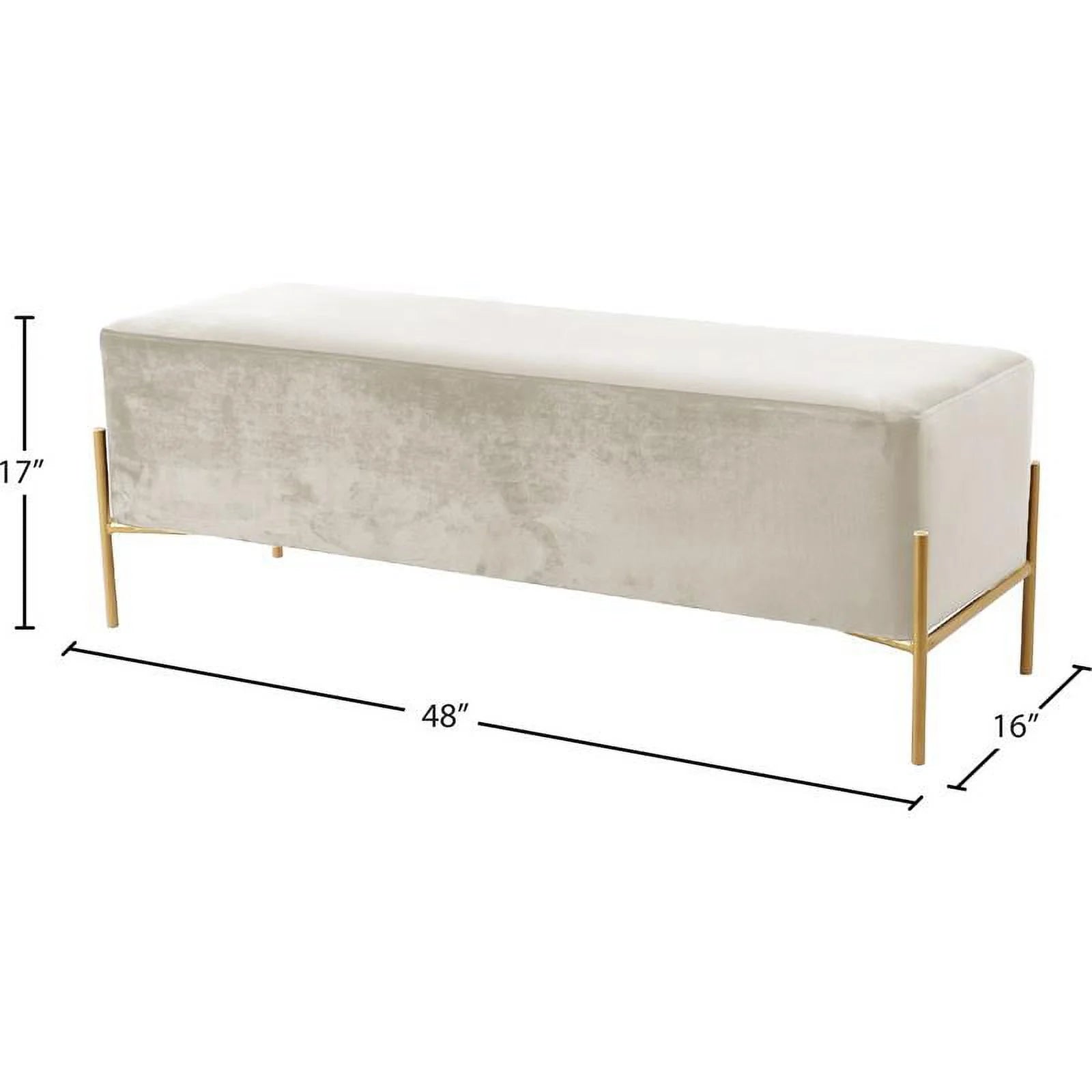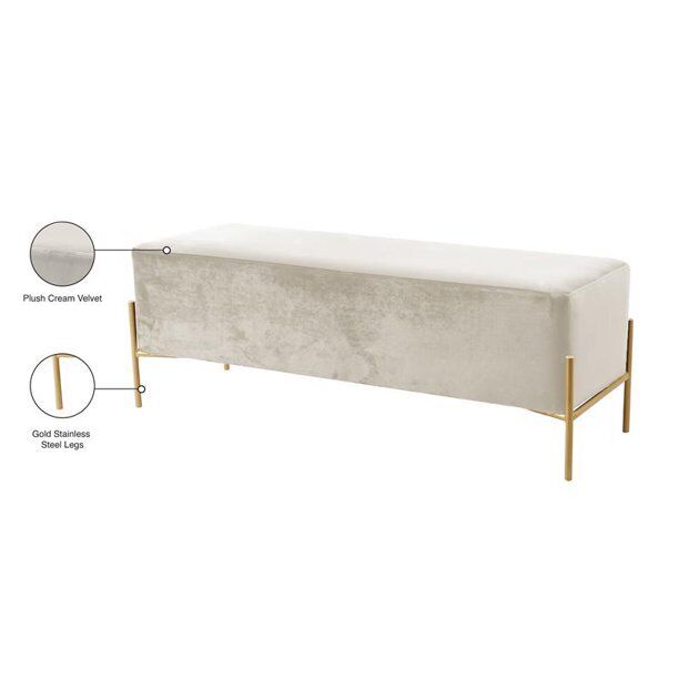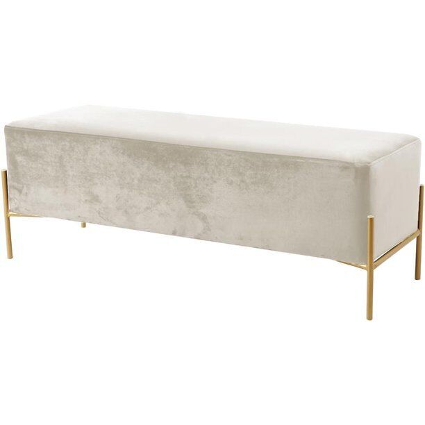 Add the chicness of white and gold to your bedroom or dressing room with this IslaVelvet Bench in White. This oversized bench is just right for placing at the foot of your bed, giving you a spot to rest while you put on your shoes or read before bed. The sleek white velvet upholstery feels rich to the touch and adds an upscale look to this piece and feels buttery soft beneath your skin. The gold tone base offers reliable support and gives the bench durability, so it lasts and lasts in your home.