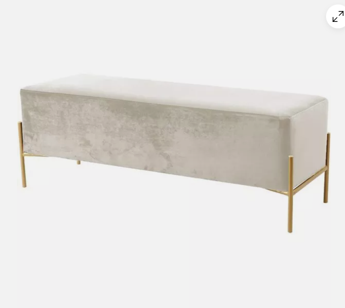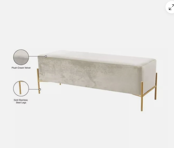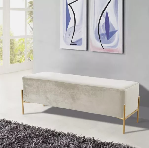 Add the chicness of white and gold to your bedroom or dressing room with this IslaVelvet Bench in White. This oversized bench is just right for placing at the foot of your bed, giving you a spot to rest while you put on your shoes or read before bed. The sleek white velvet upholstery feels rich to the touch and adds an upscale look to this piece and feels buttery soft beneath your skin. The gold tone base offers reliable support and gives the bench durability, so it lasts and lasts in your home.