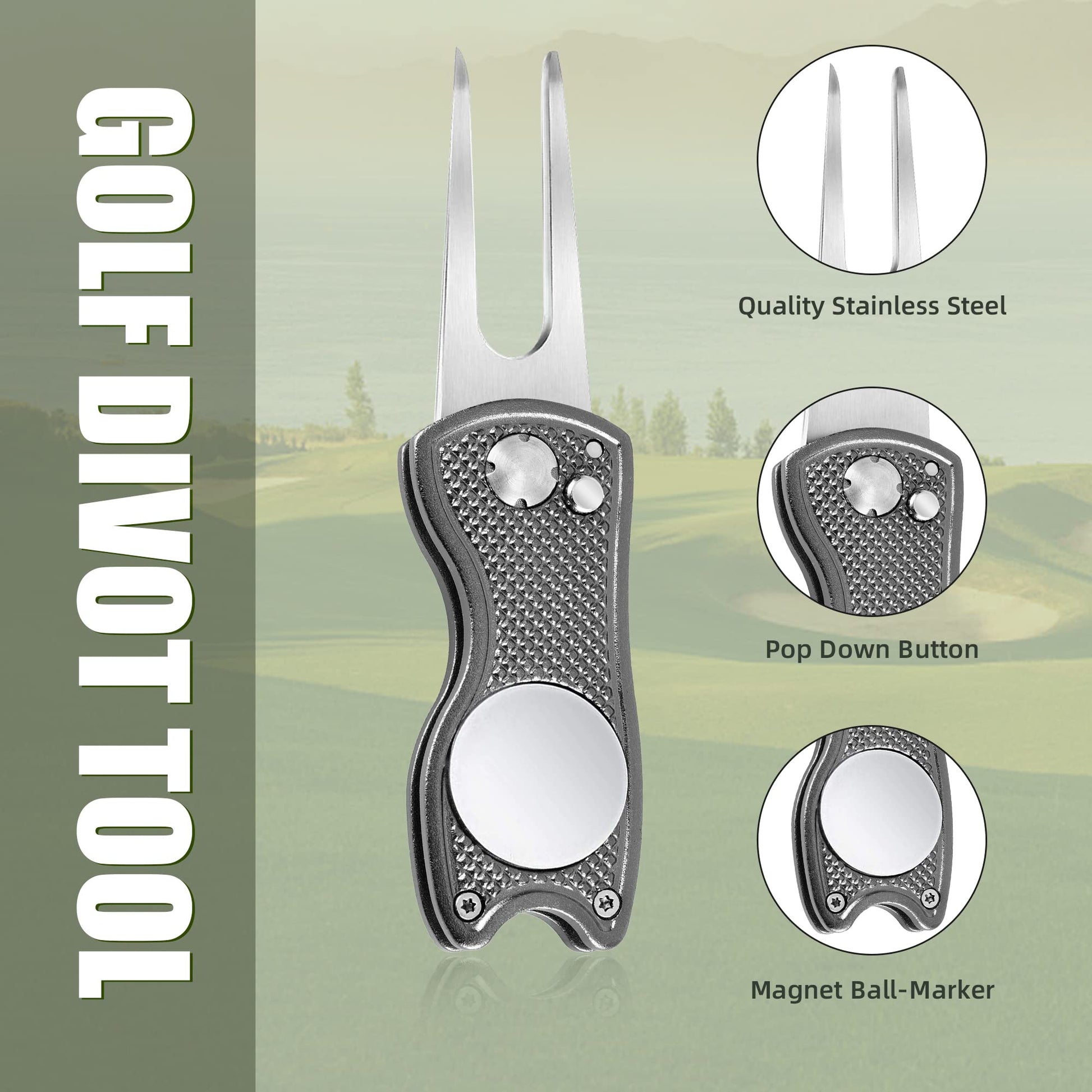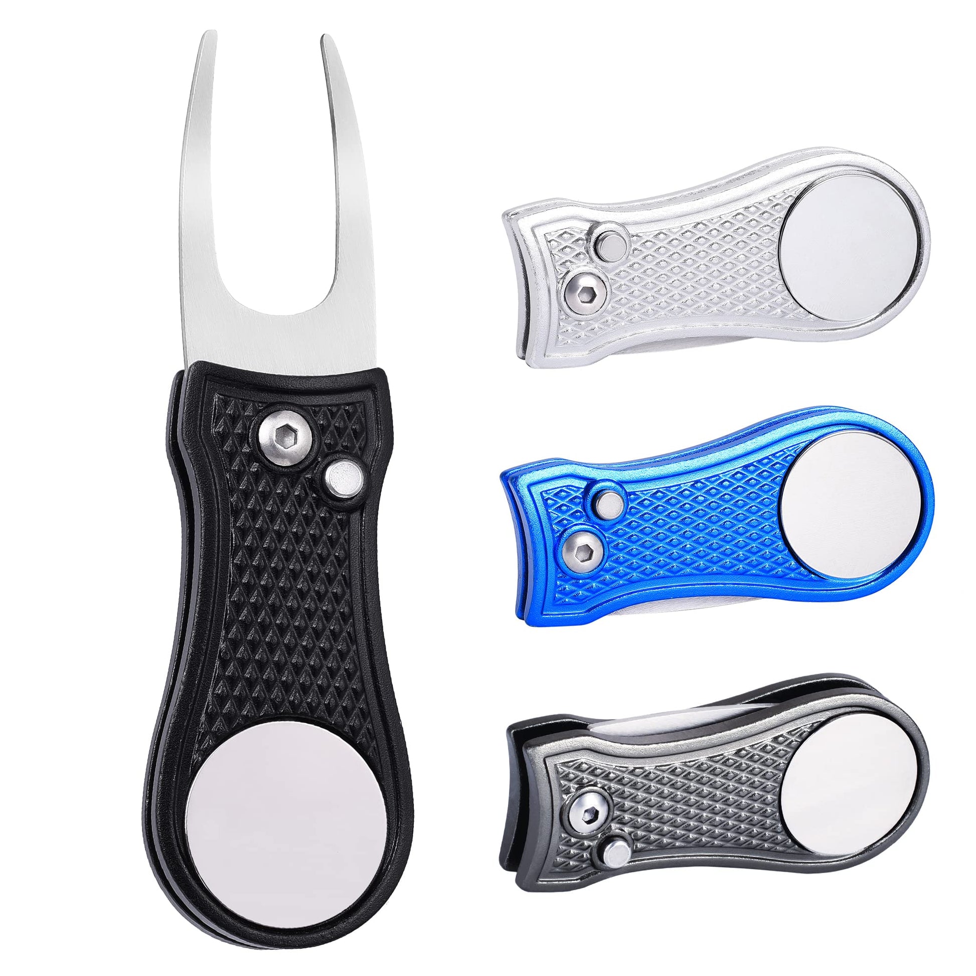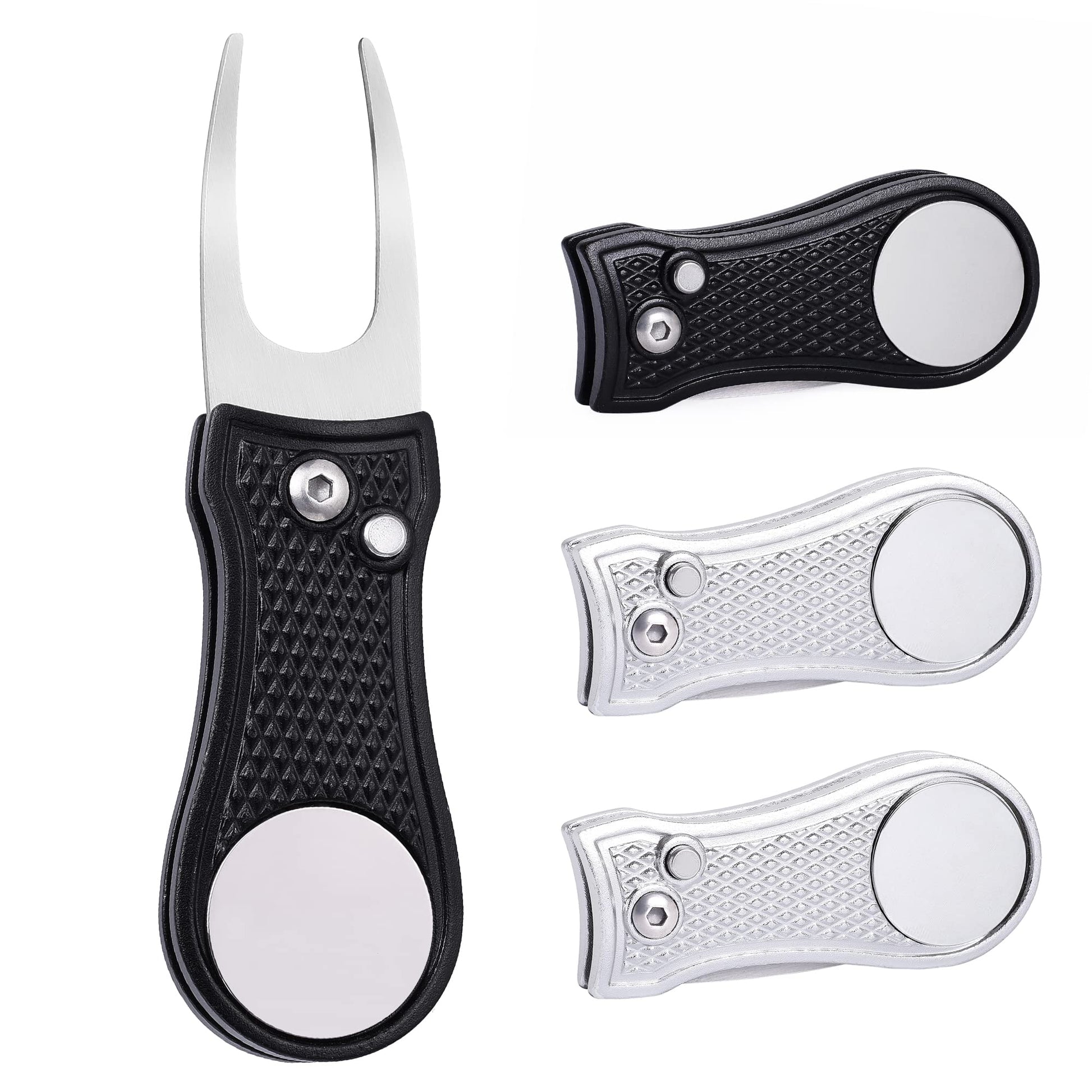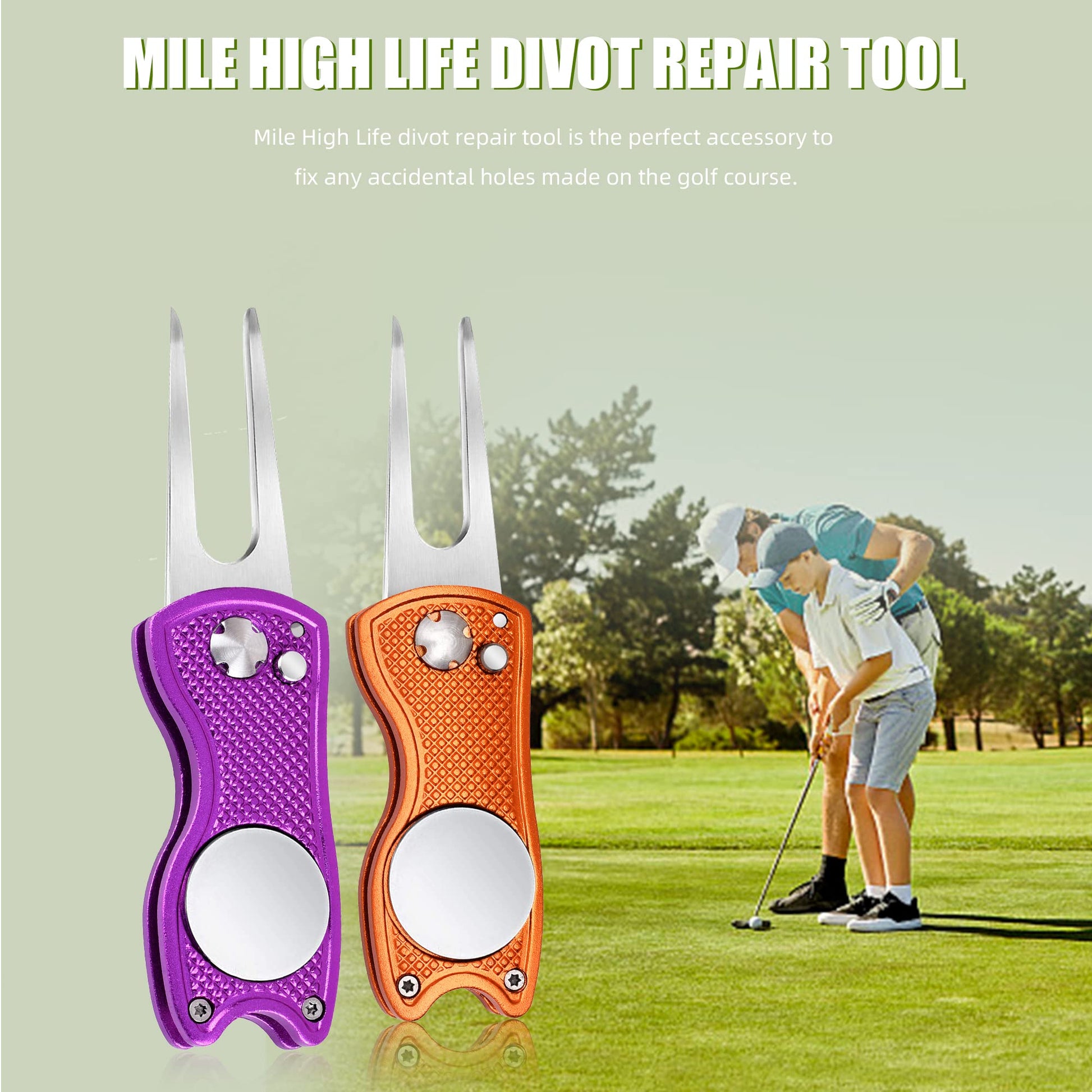 Mile High Life 4 Pieces Golf Divot Repair Tool w Magnetic Golf Ball Marker | All Metal Foldable Divot Tool w Pop-up Button | Golf Accessories for Men