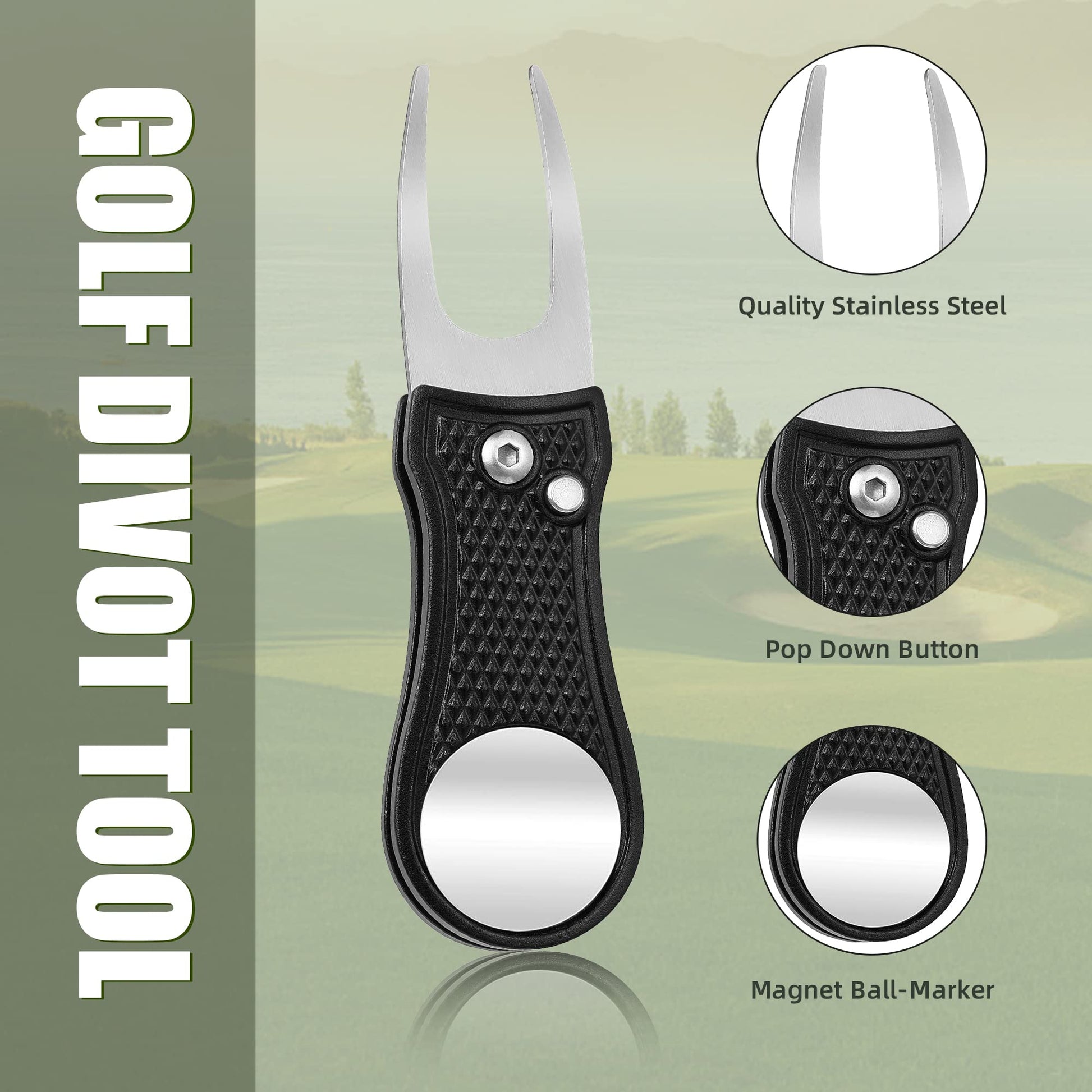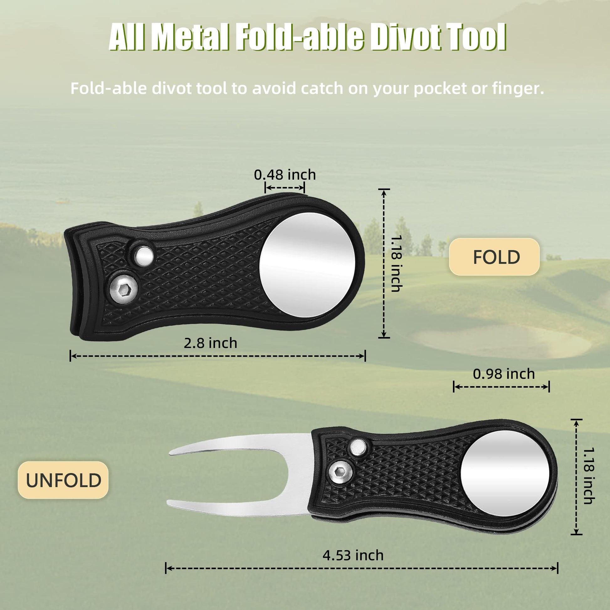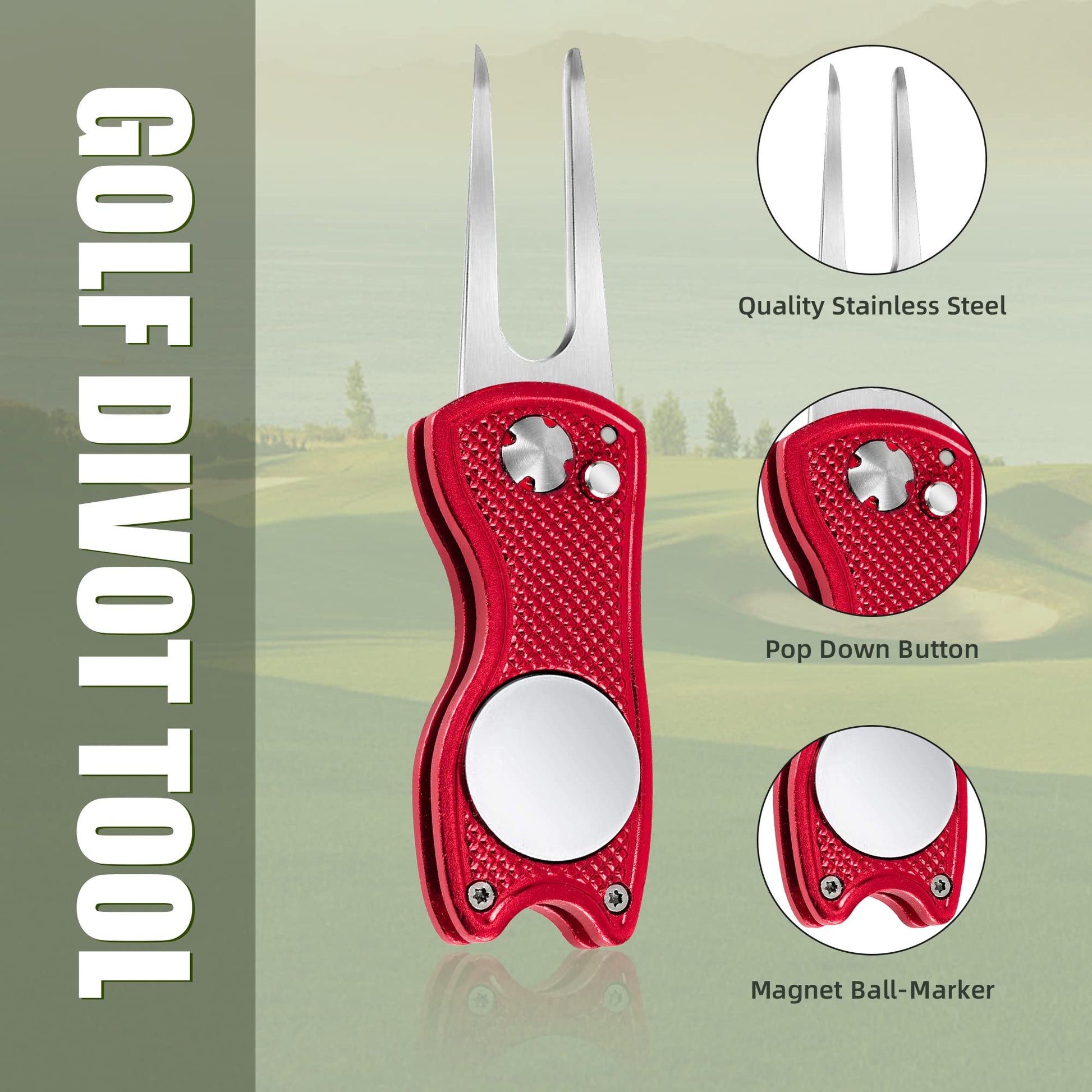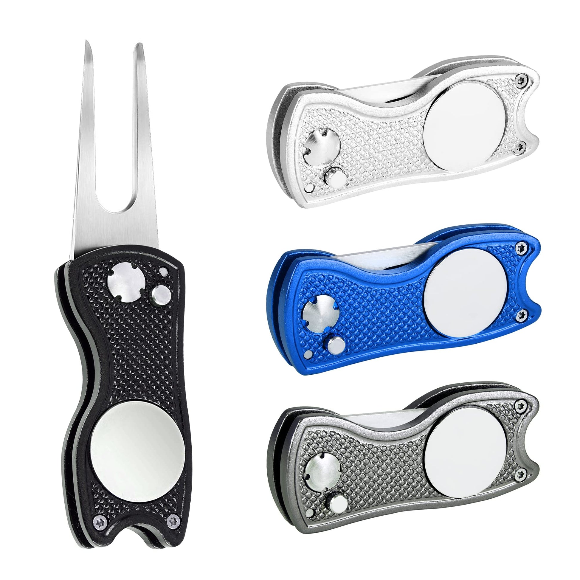 Mile High Life 4 Pieces Golf Divot Repair Tool w Magnetic Golf Ball Marker | All Metal Foldable Divot Tool w Pop-up Button | Golf Accessories for Men
