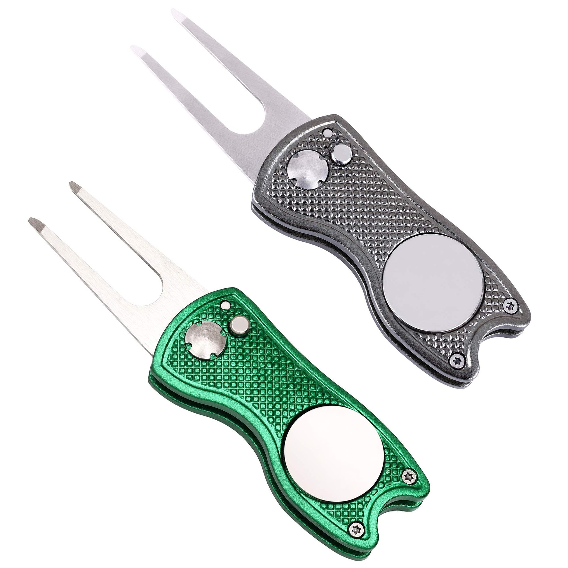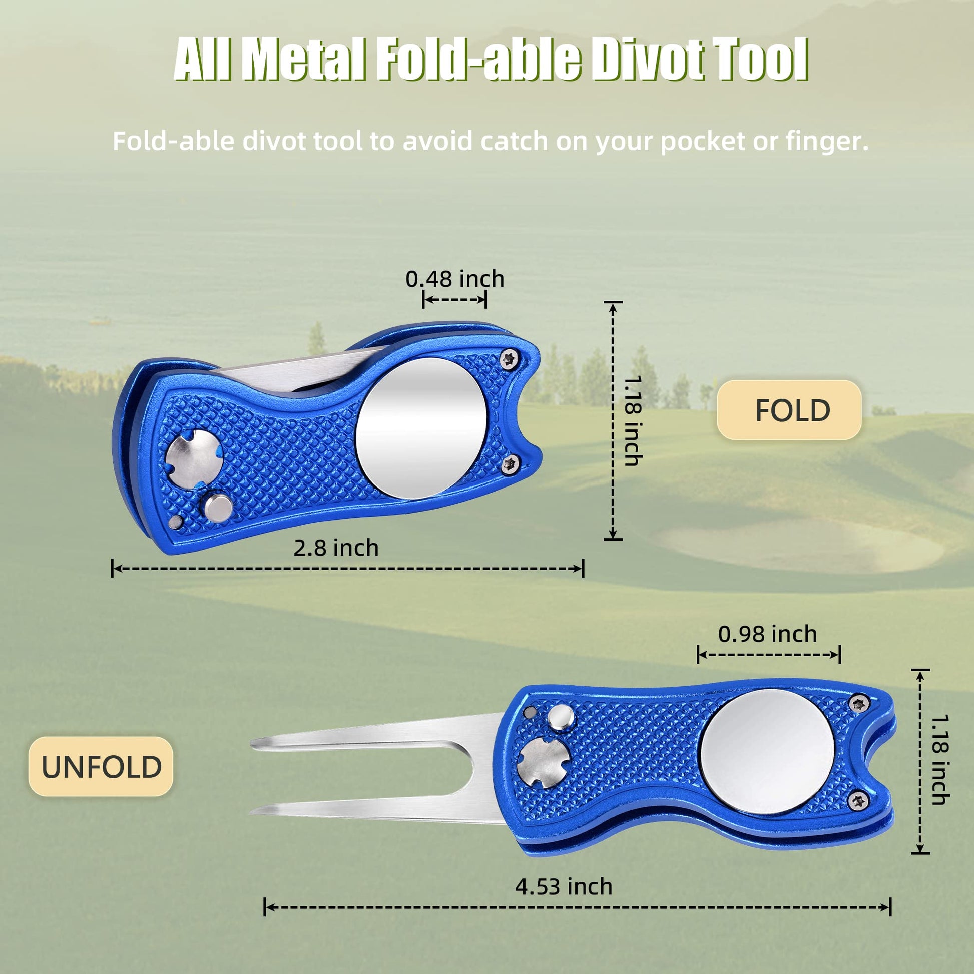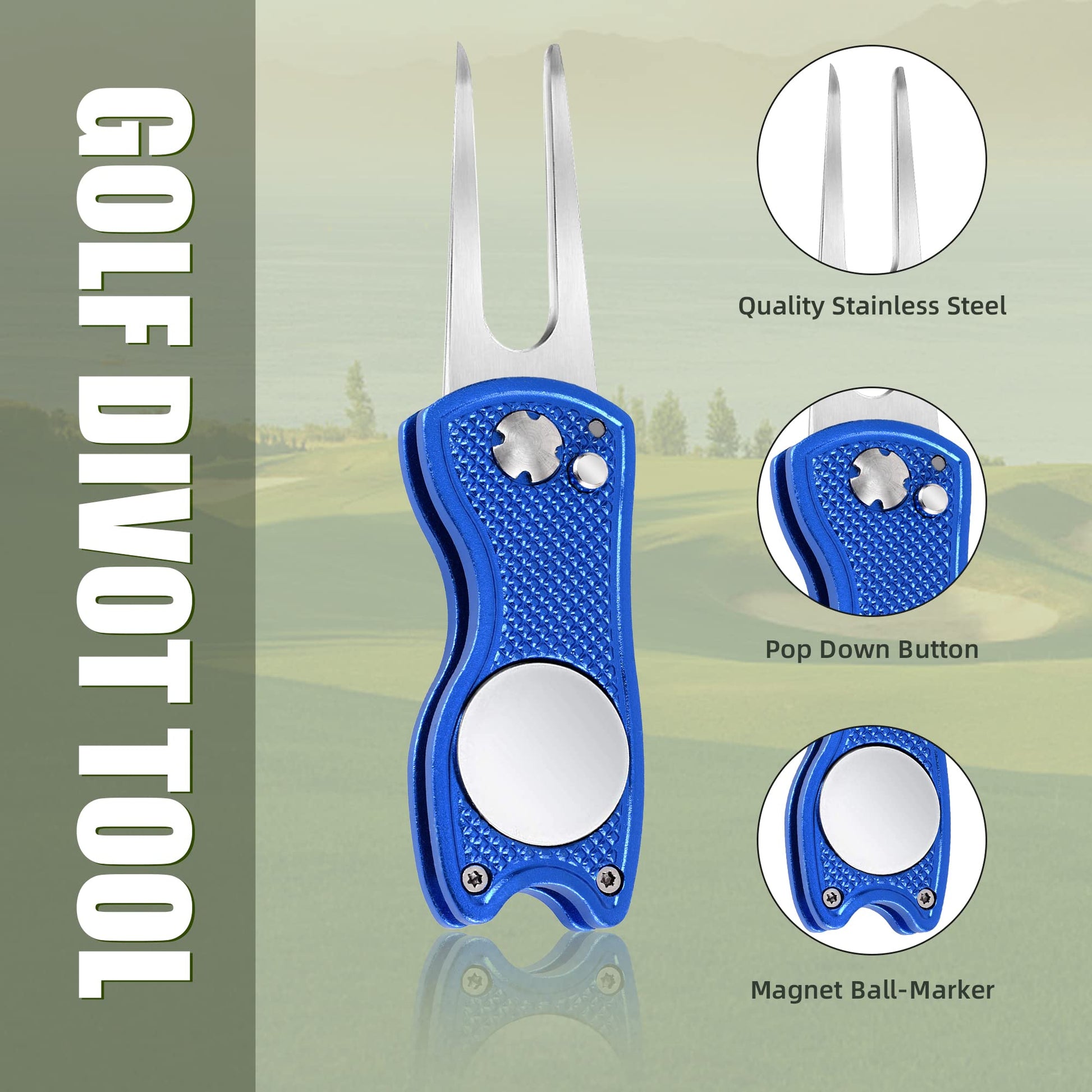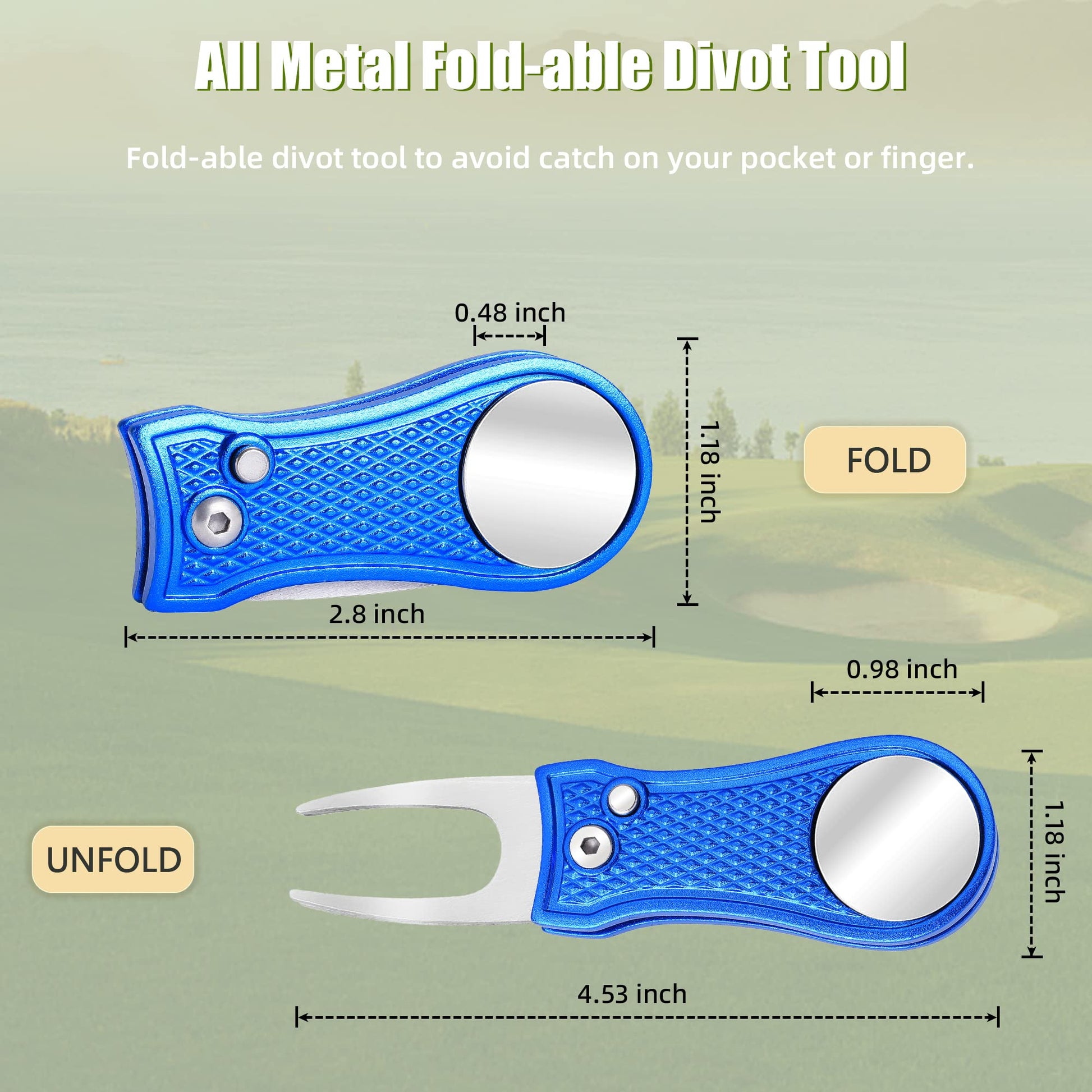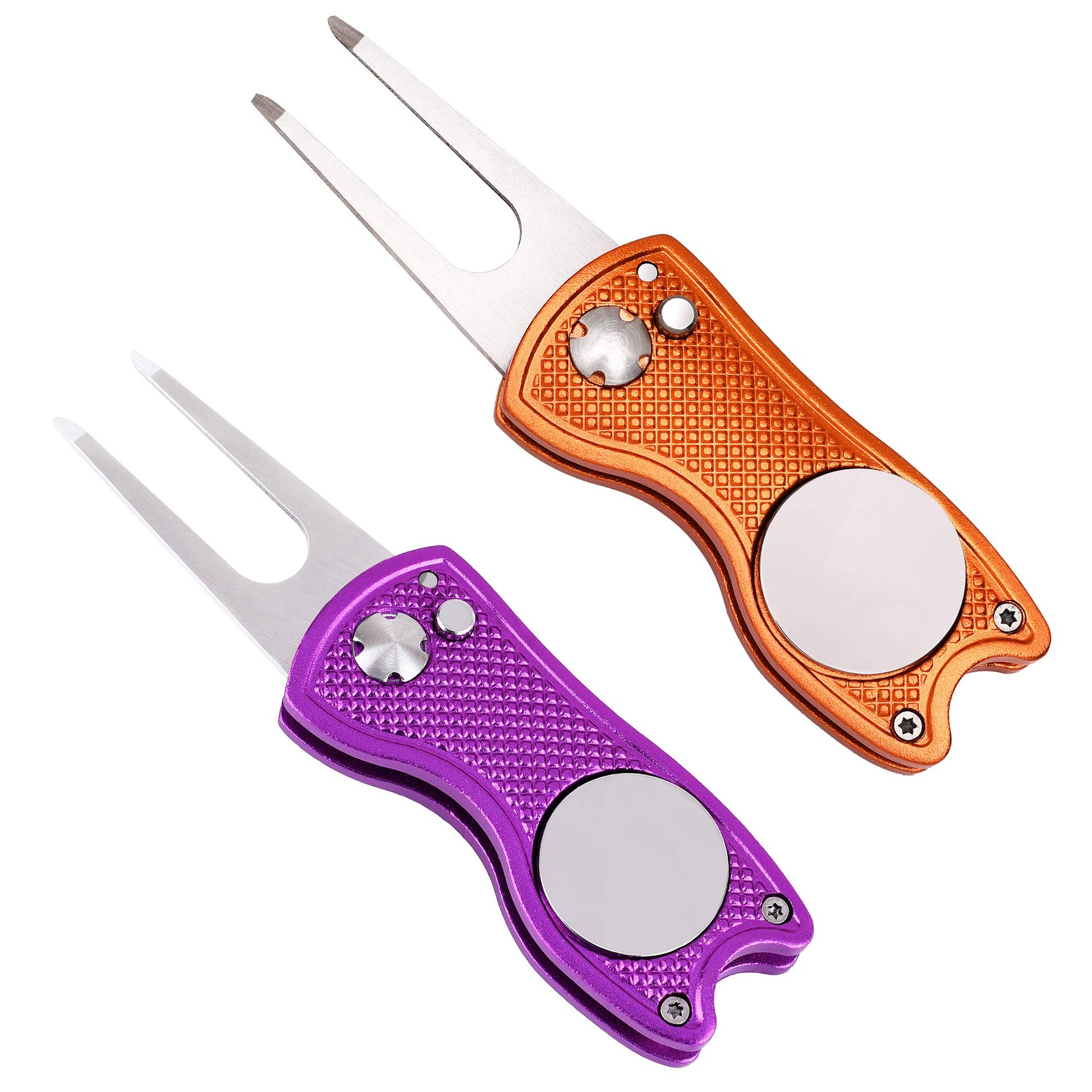 Mile High Life 4 Pieces Golf Divot Repair Tool w Magnetic Golf Ball Marker | All Metal Foldable Divot Tool w Pop-up Button | Golf Accessories for Men