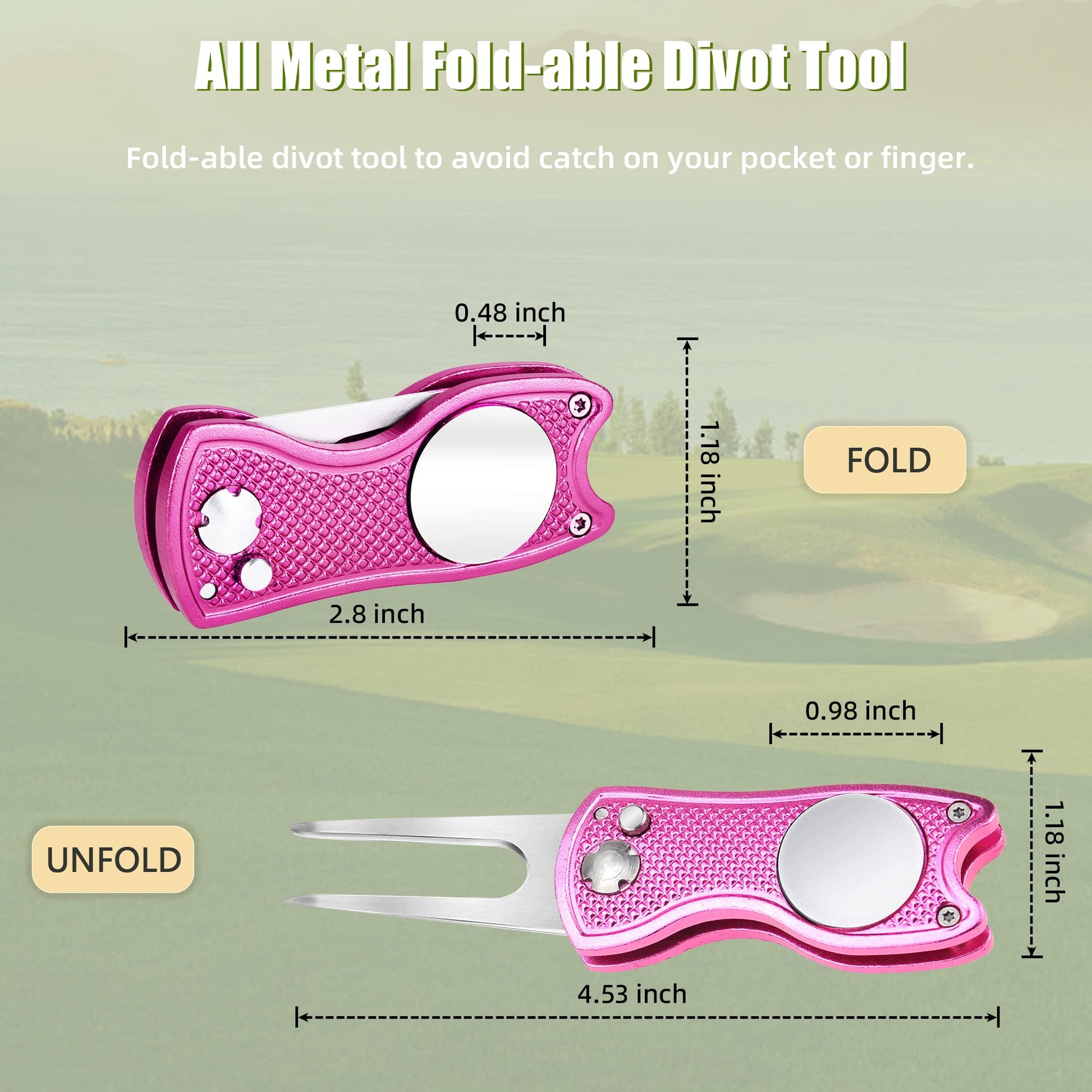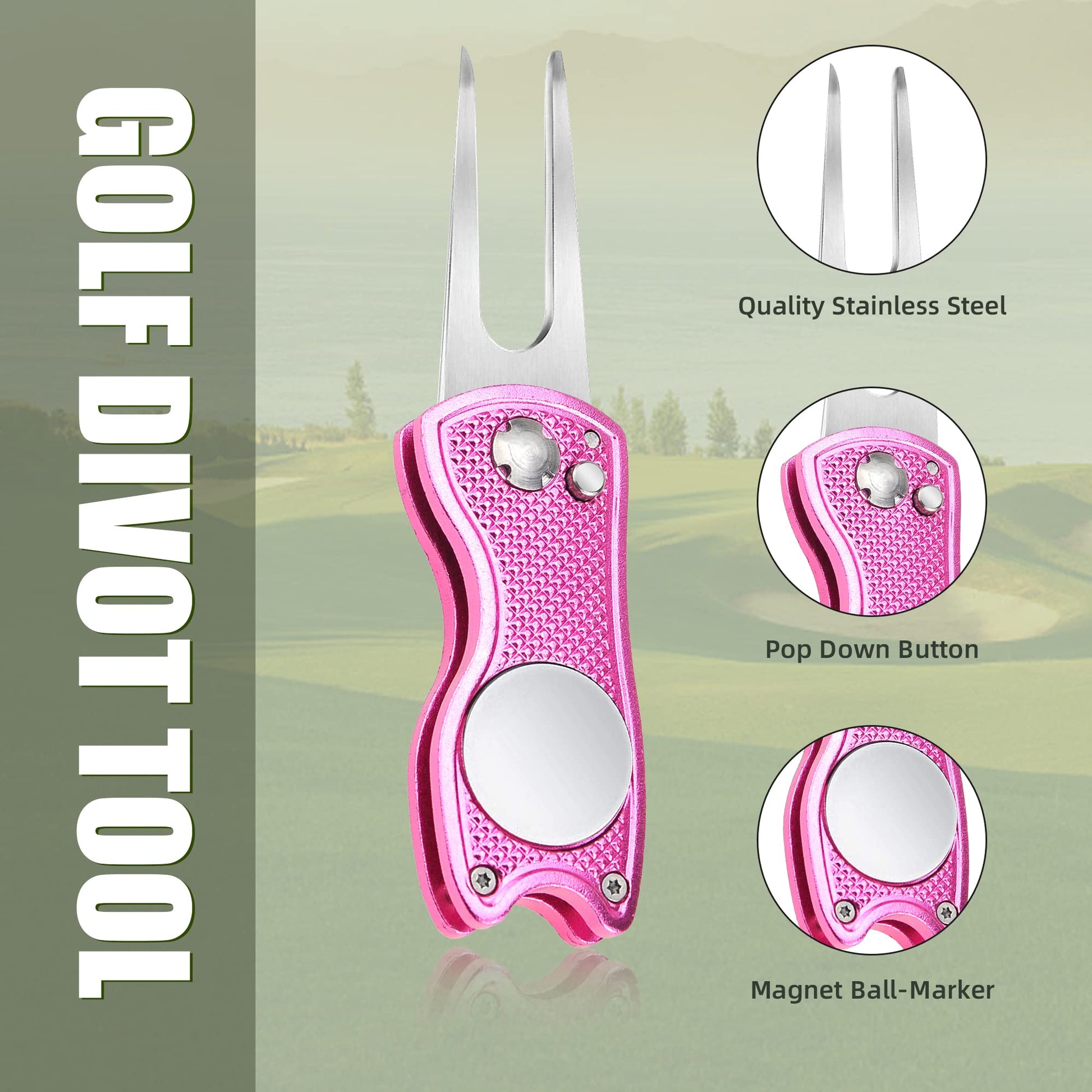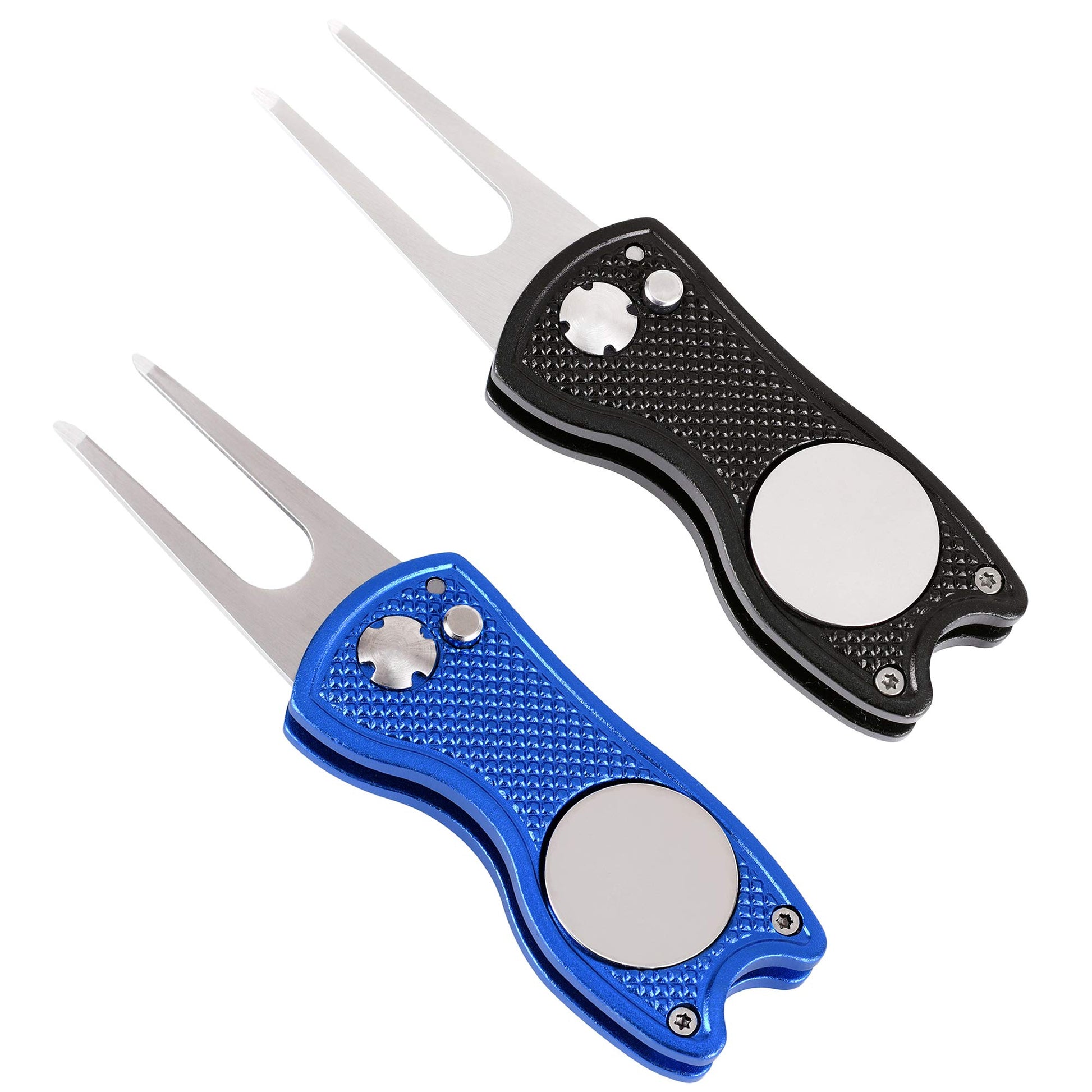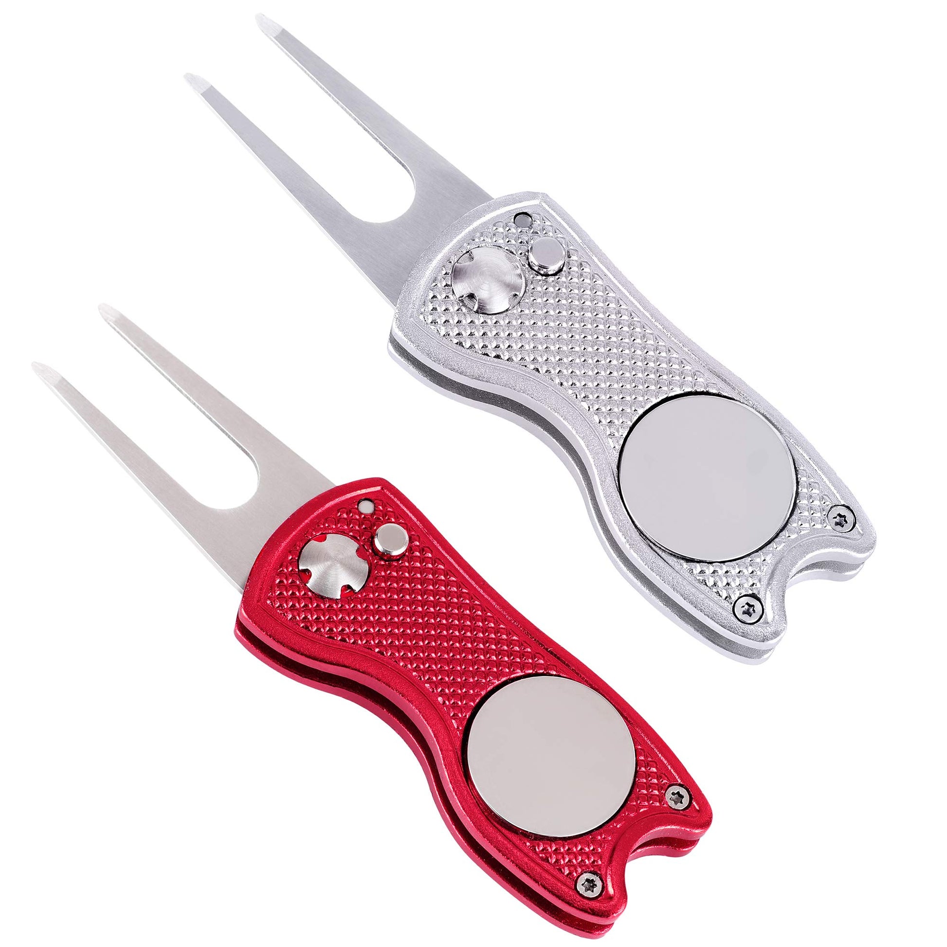Mile High Life 4 Pieces Golf Divot Repair Tool w Magnetic Golf Ball Marker | All Metal Foldable Divot Tool w Pop-up Button | Golf Accessories for Men