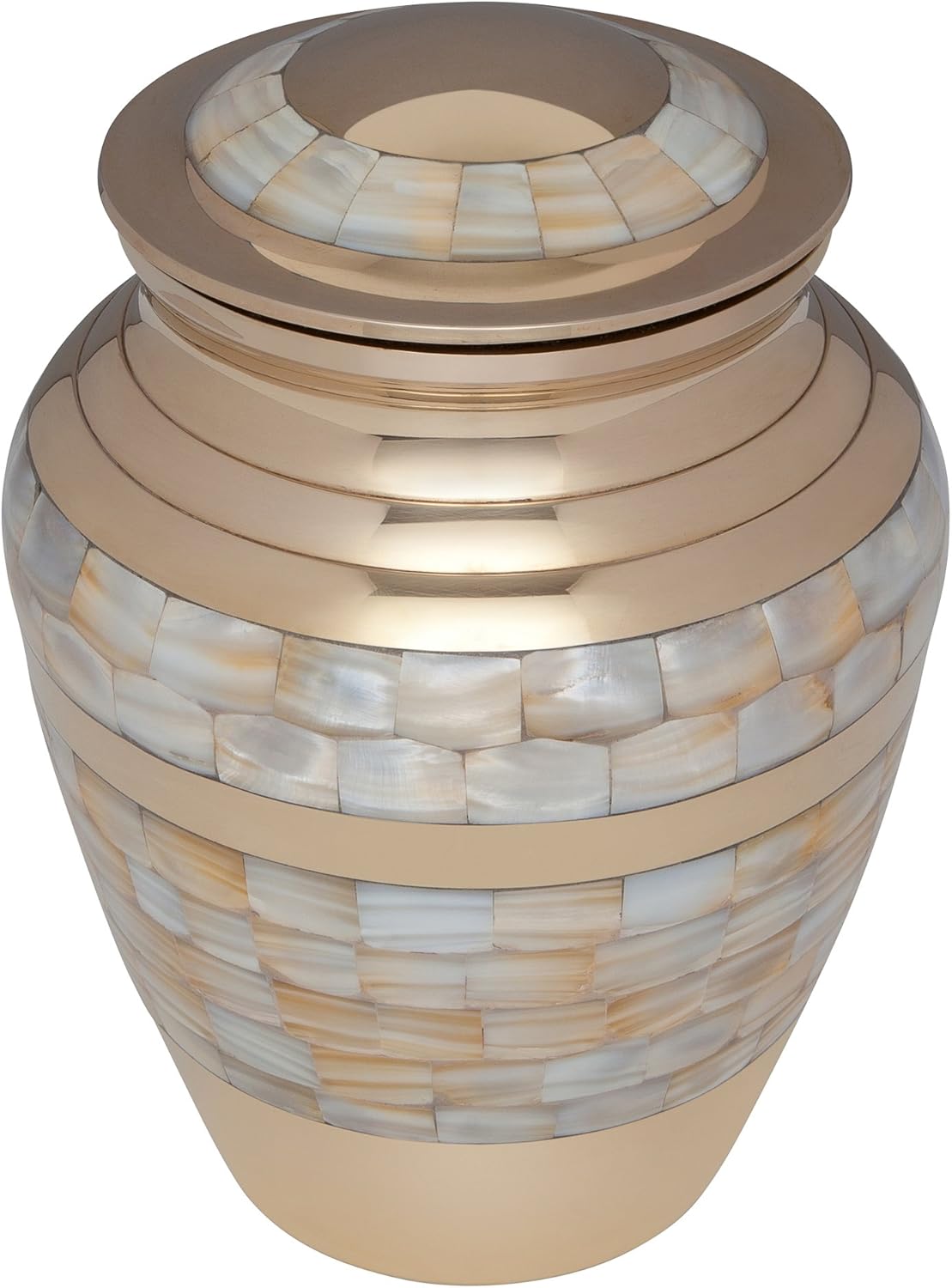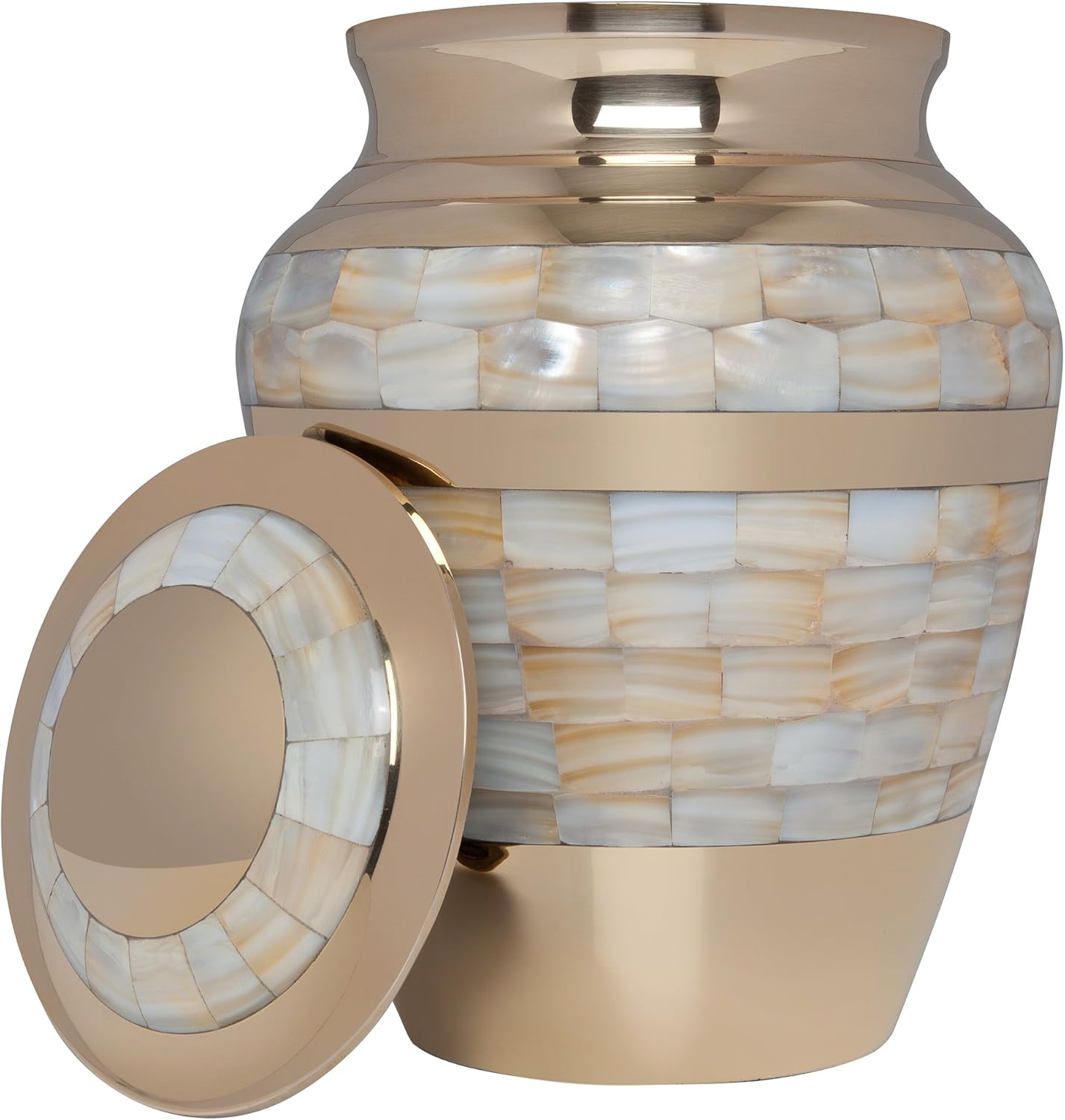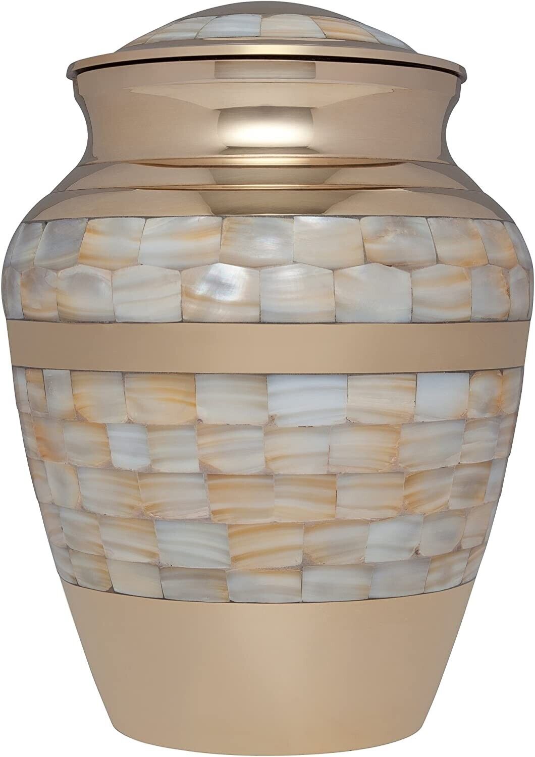 Mother of Pearl Gold Funeral Urn by Cremation Urn for Human Ashes - Hand Made in Brass - Suitable for Cemetery Burial or Niche - Large Size fits remains of Adults up to 200 lbs - Mother of Pearl
