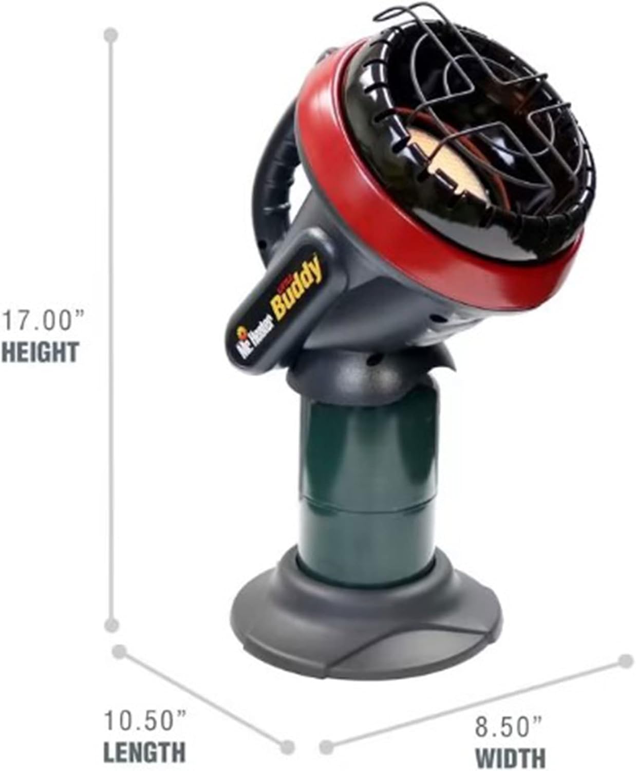 - Compact but powerful heater with 3800 BTU of heat; Ideal for decks, patios, campsites, fishing, hunting, and emergency situations; Dimensions (L x W x H): 10.5 x 8.5 x 17 inches