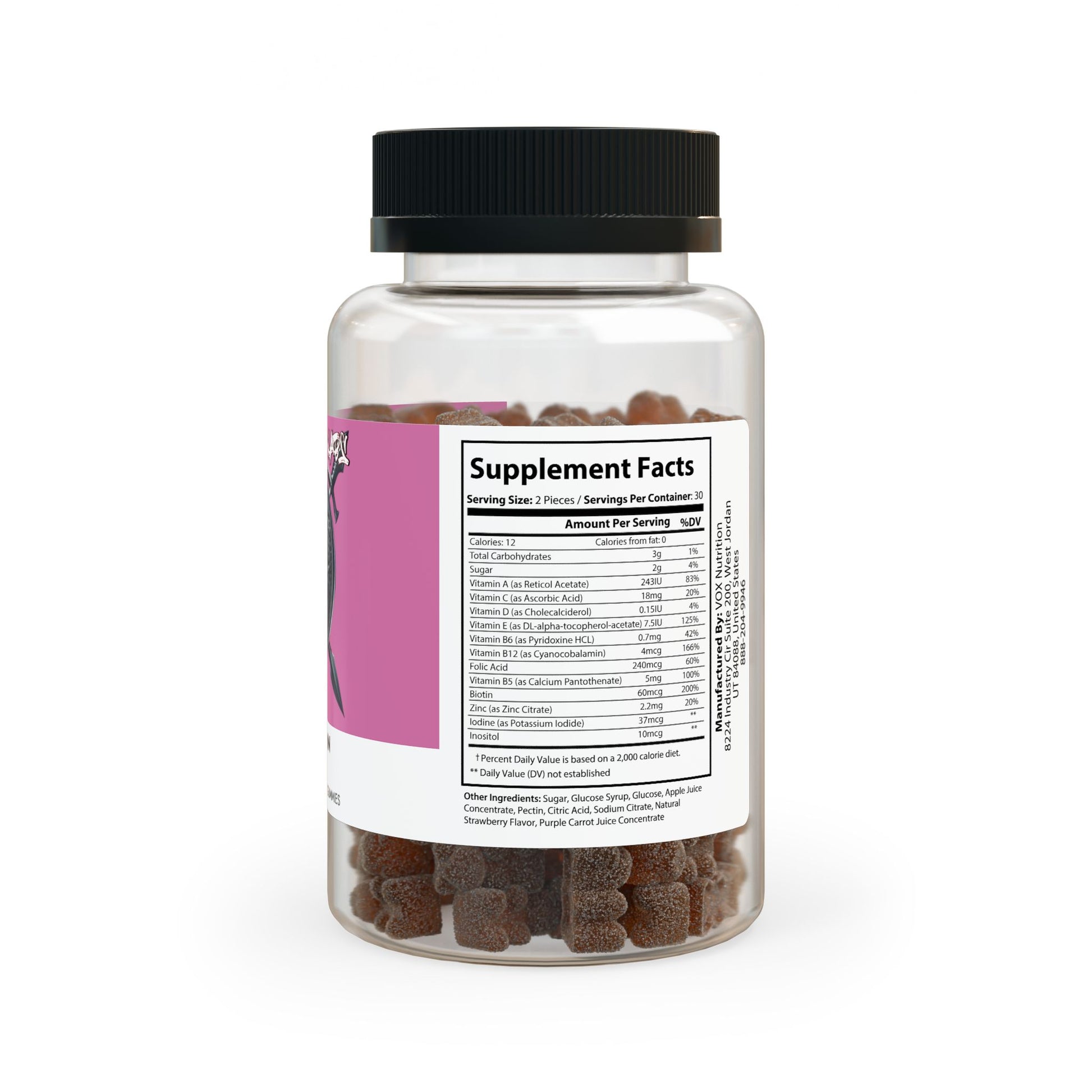 Ingredients: Vitamin A (as Reticol Acetate), Vitamin C (as Ascorbic Acid), Vitamin D (as Cholecalciderol), Vitamin E (as DL-alpha-tocopherol-acetate), Vitamin B6 (as Pyridoxine HCL), Vitamin B12 (as Cyanocobalamin), Folic Acid, Vitamin B5 (as Calcium Pantothenate), Biotin, Zinc (as Zinc Citrate), Iodine (as Potassium Iodide), Inositol. Other Ingredients: Sugar, Glucose Syrup, Glucose, Apple Juice Concentrate, Pectin, Citric Acid, Sodium Citrate, Natural Strawberry Flavor, Purple Carrot Juice Concentrate