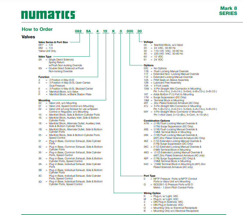 NUMATICS/AVENTICS MARK 8 SERIES VALVES HAVE A PLUG-IN BASE OR MANIFOLD, A PLUG-IN SOLENOID AND AN OPTIONAL PLUG-IN SANDWICH SPEED CONTROL. THE UNIT TO BASE ELECTRICAL PLUG PERMITS INSTANT VALVE UNIT REPLACEMENT WITHOUT DISCONNECTING PIPING OR WIRING.