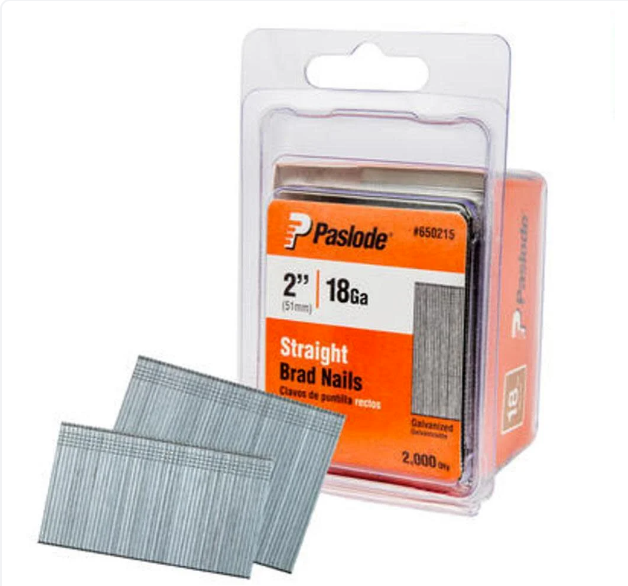 Paslode 18 ga. Brad nails for use with 18 gauge finish nailers. These nails are available in 1 In. to 2 In. nail ranges. They are galvanized for superior corrosion resistance. Each box contains 2,000 nails.