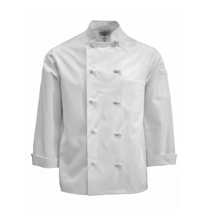 For a clean cut and professional look, our long sleeve Knot Button Chef Coat is a must. This classic style Knot Button Coat offers the sturdiness and reliability needed for any professional kitchen, equipped with a left side chest pocket, thermometer pocket, and 10 cloth knot buttons in a double-breasted finish. With built-to-last durability, this coat offers the ease of “wash and wear” performance