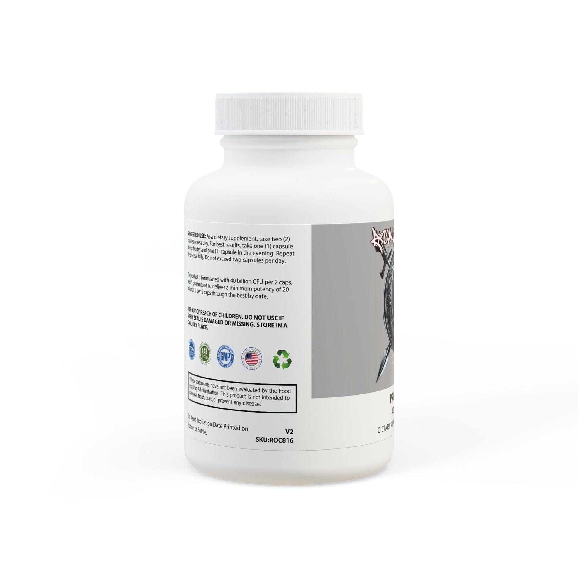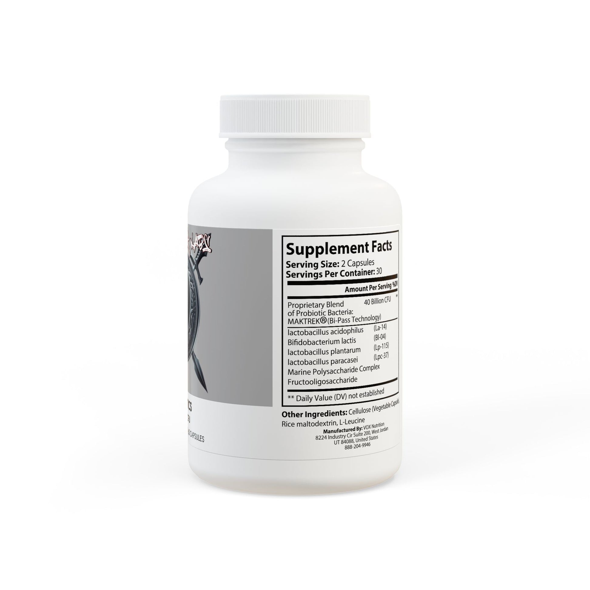 Key ingredients include a Proprietary Blend of Probiotic Bacteria with MAKTREK® (Bi-Pass Technology), Lactobacillus acidophilus, Bifidobacterium lactis, Lactobacillus plantarum, Lactobacillus paracasei, Marine Polysaccharide Complex, and Fructooligosaccharide® (FOS).