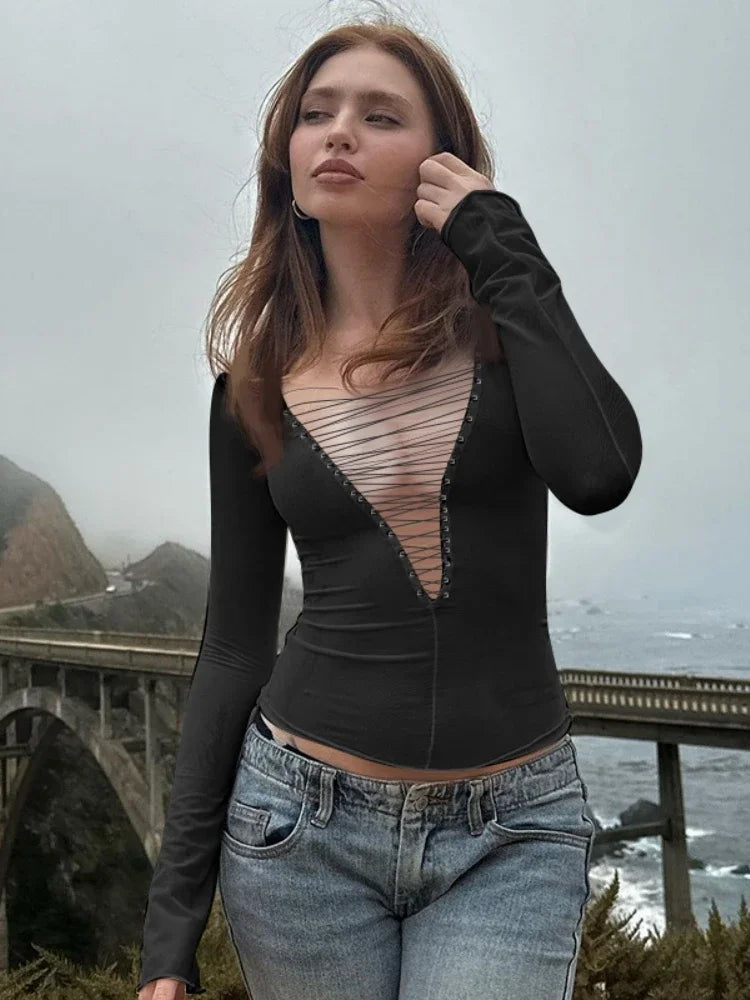 V-Neck Hollow-Out Long Sleeve Slim-Fit Top T Shirt