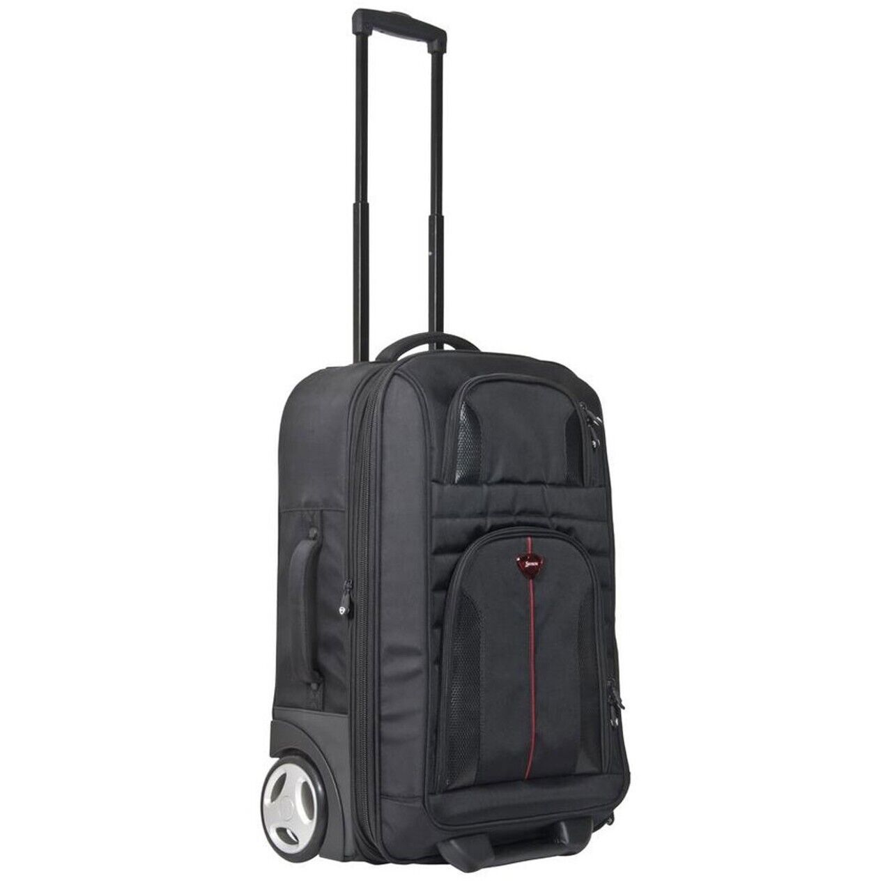 MODEL SPECIFICS: 1680 Ballistic nylon, Easy entry main compartment opening, Dual internal mesh zipped compartments, Internal side accessory pockets, Telescopic pull handle, Heavy-duty chassis with oversized smooth ride urethane wheels, Meets most airline carry-on size regulations, Size: L14" x 21" x 10.5", Color: Black/Red