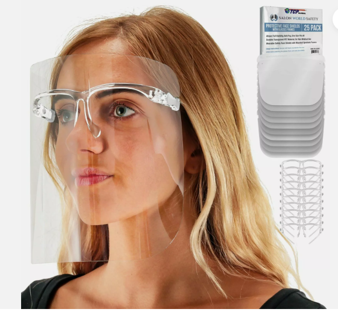 TCP Global Salon World Safety Face Shields with Glasses Frames (Pack of 25) - Ultra Clear Protective Full Face Shields to Protect Eyes, Nose, Mouth - Anti-Fog PET Plastic, Goggles