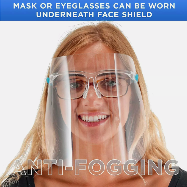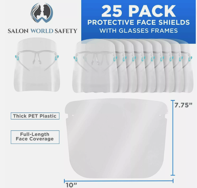 - 25 Pack of Face Shields with Glasses Frames: Sanitary, durable, lightweight, and comfortable premium protective face shields that are made with ultra-clear thick plastic. Each face shield contains an internally mounted comfort fit acrylic glasses frame. Wear the face shields just like you would when wearing glasses over your ears and on your nose bridge, but you'll also have a face shield for protection. Wear your eyeglasses underneath. One size fits all.
