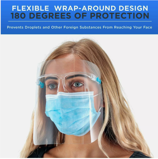 - Full Face Protection while Avoiding the Headband: Safety full-length face shield with a flexible wrap-around design that provides side and front face protection. The shields have 180 degrees of protection and provide full coverage of the eyes, nose, and mouth to help prevent droplets of saliva, coughs, sneezes, and other foreign substances from reaching your face. Dimensions: 7.75" high x 10" wide.