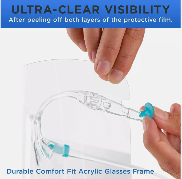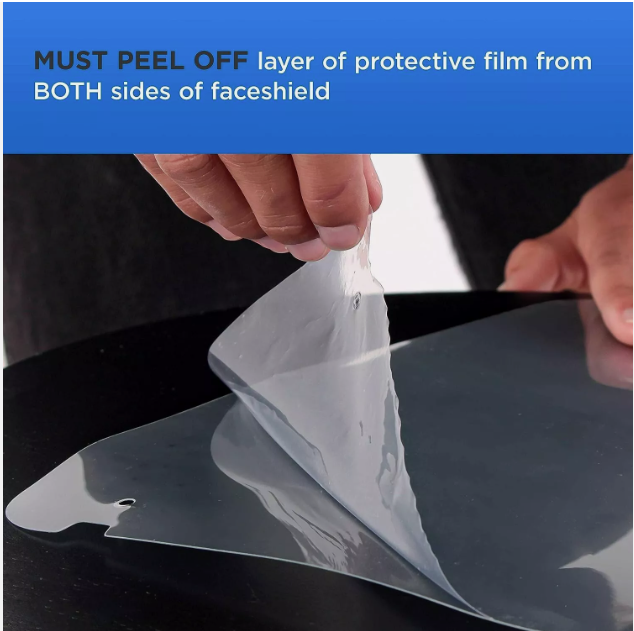 - Ultra-Clear and Anti-Fogging: Face shields provide super clear visibility and have superior optics that let in the maximum amount of light, while the anti-fogging material resists fog under extended use. The shield is crystal clear, after peeling off both layers of the protective film. Reusable after disinfecting. Some assembly required.