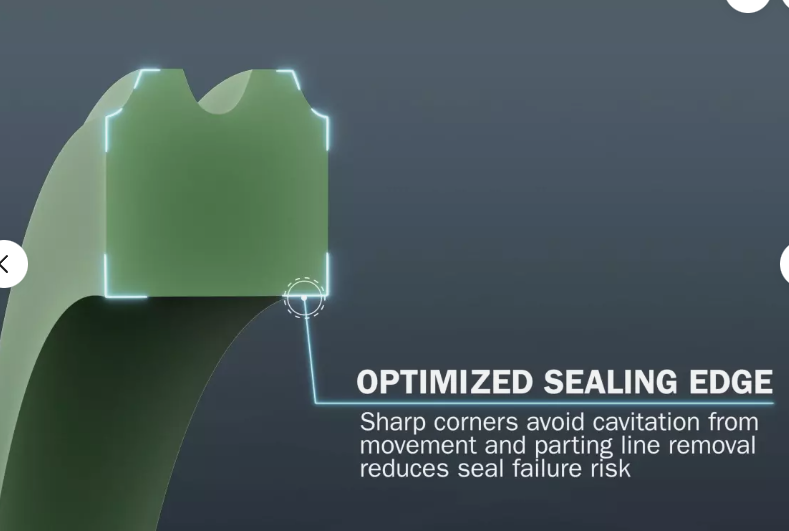 Trelleborg’s double D-shaped design includes sharper edges that ensure a tight seal fit, for example, against a cylinder lining, evenly distributing pressure to improve seal performance and eliminate the risk of leakage or cavitation damage, where water vapor bubbles form and damage metallic components.