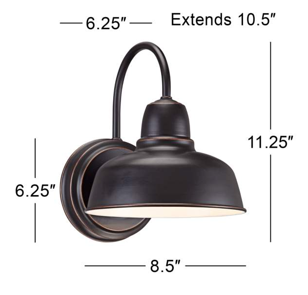 From the Urban Barn collection by John Timberland, this indoor-outdoor wall light comes in a charming industrial farmhouse style. The steel frame features a wide downlight shade attached to the end of a thin, arching gooseneck arm. An oil rubbed bronze finish adds a handsome rustic touch. Perfect for use in a porch or patio area.