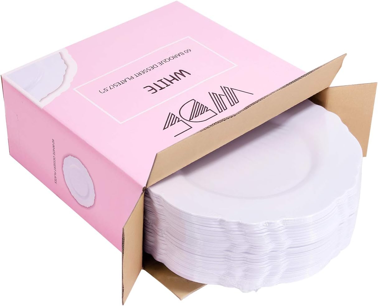 WDF 60pcs White Plastic Plates -7.5inch Baroque White Disposable Appetizer Plates Small Plates Cake Plates- Dessert/Salad Plates for Upscale Parties &Wedding