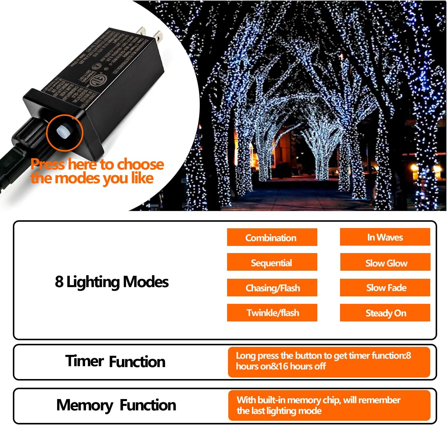 - 【Unique 8 Lighting Modes】: This twinkle lights have 8 modes to fit different occasions, moods, feelings, holidays, festivals, anniversaries, etc. (Combination, In waves, Sequential, Slow Glow, Chasing/Flash, Slow fade, Twinkle/Flash, Steady on). Adjust the lighting modes by pressing the round button on the adapter.